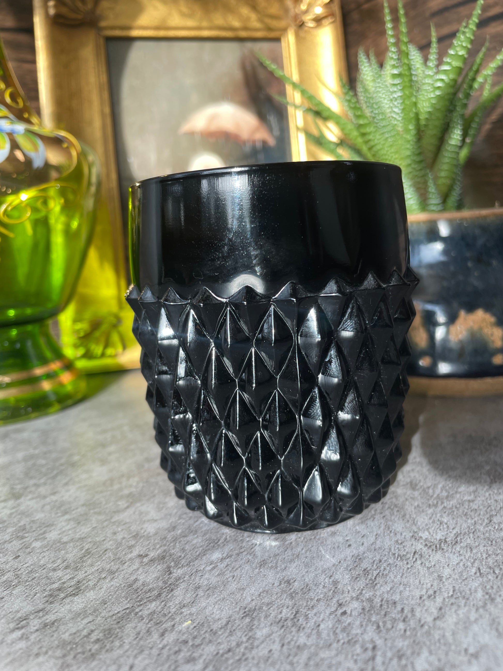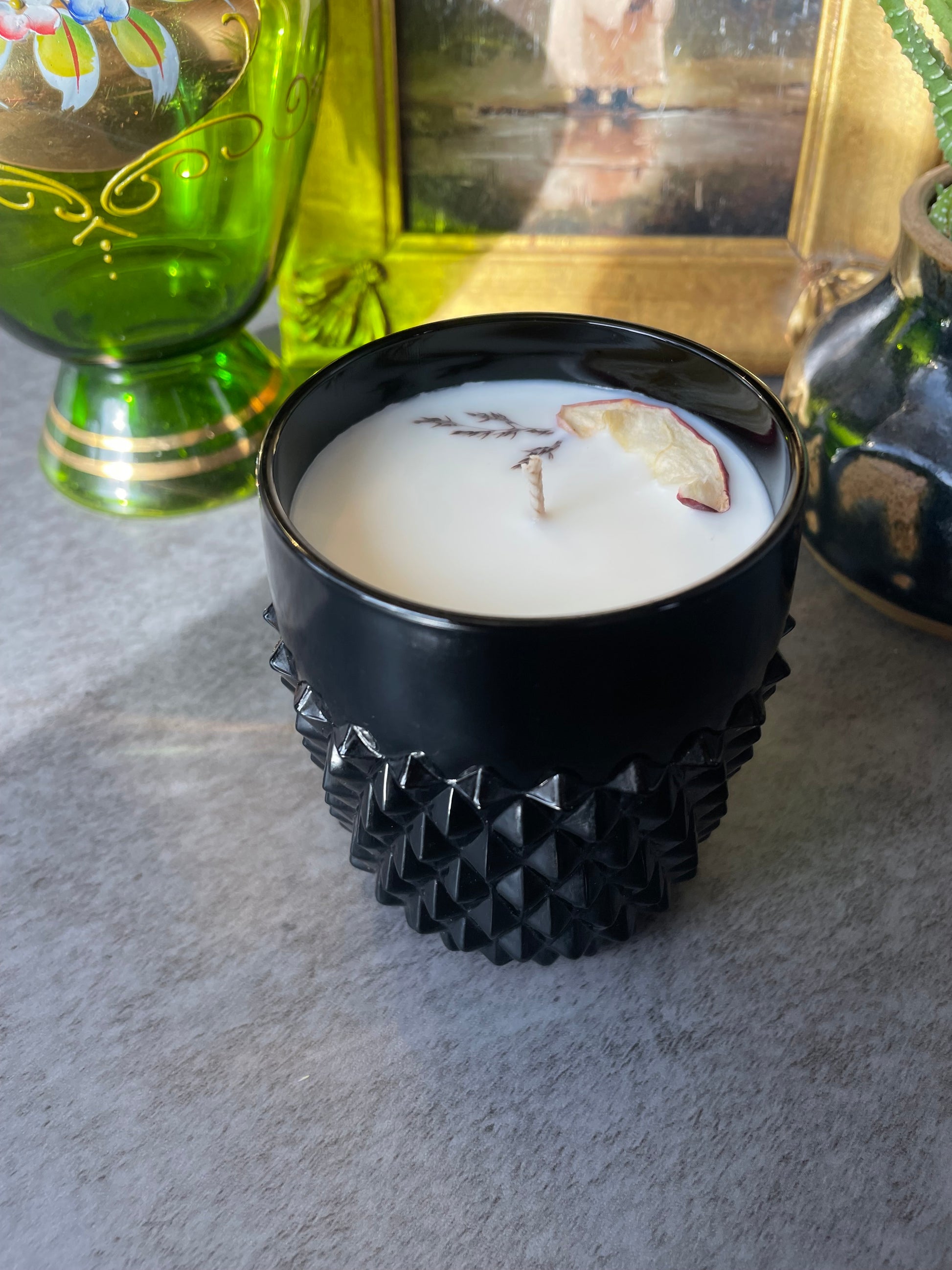 This show stopping vintage kings crown black diamond point glass is filled with our Apples and Maple Bourbon scent. It is adorned with dried flowers and a dehydrated apple slice.