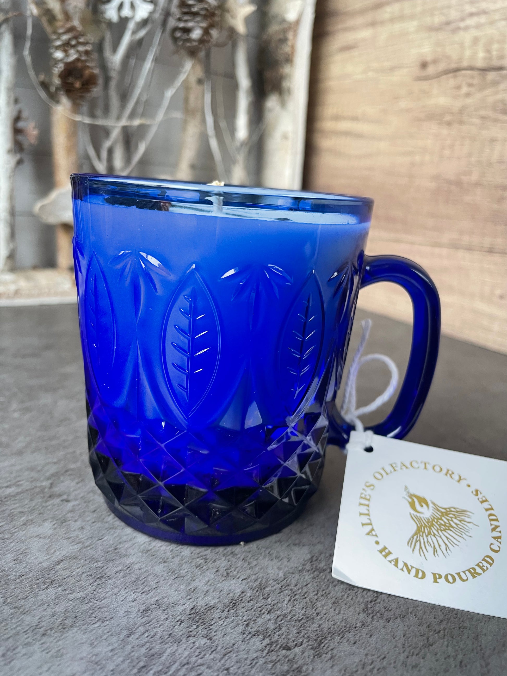 This beautiful vintage blue Avon mug is filled with our Brown Sugar and Fig scent and is adorned with dried flowers and a dehydrated fig slice.
