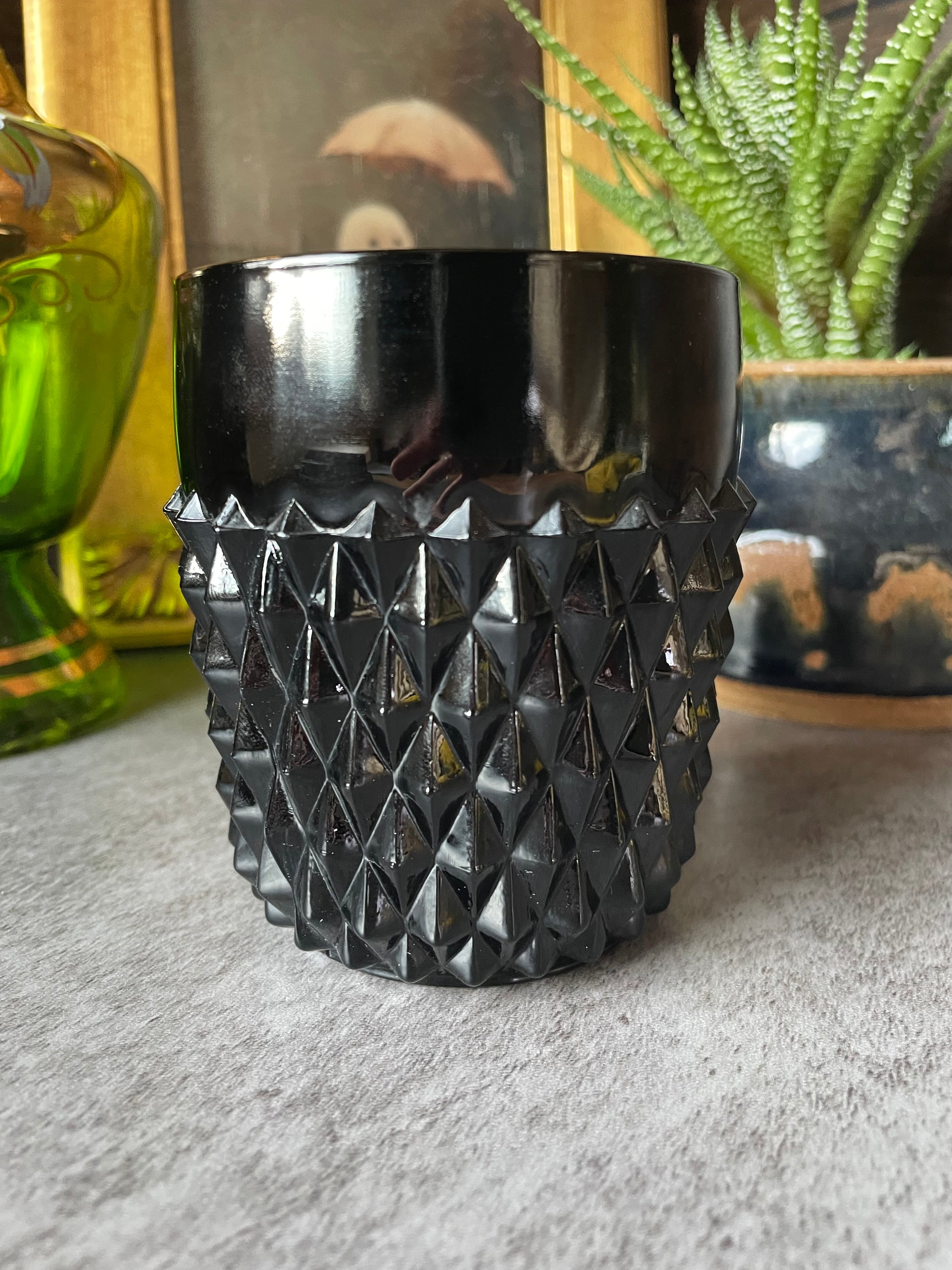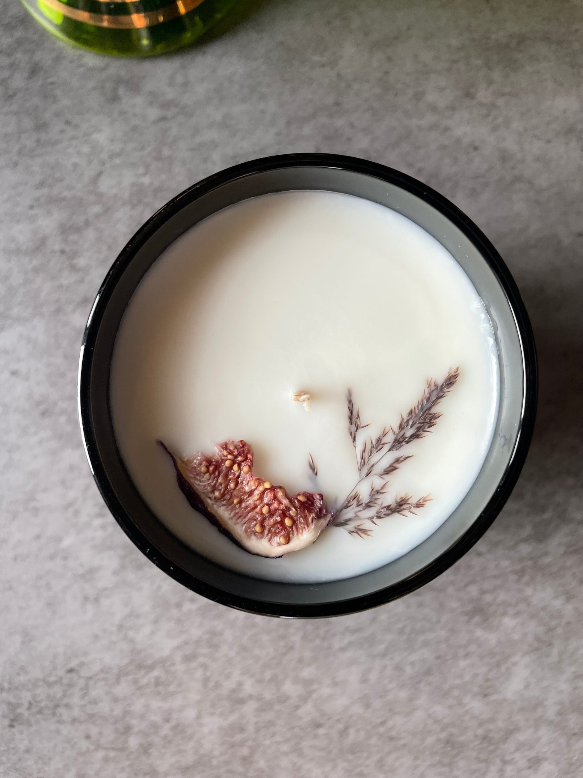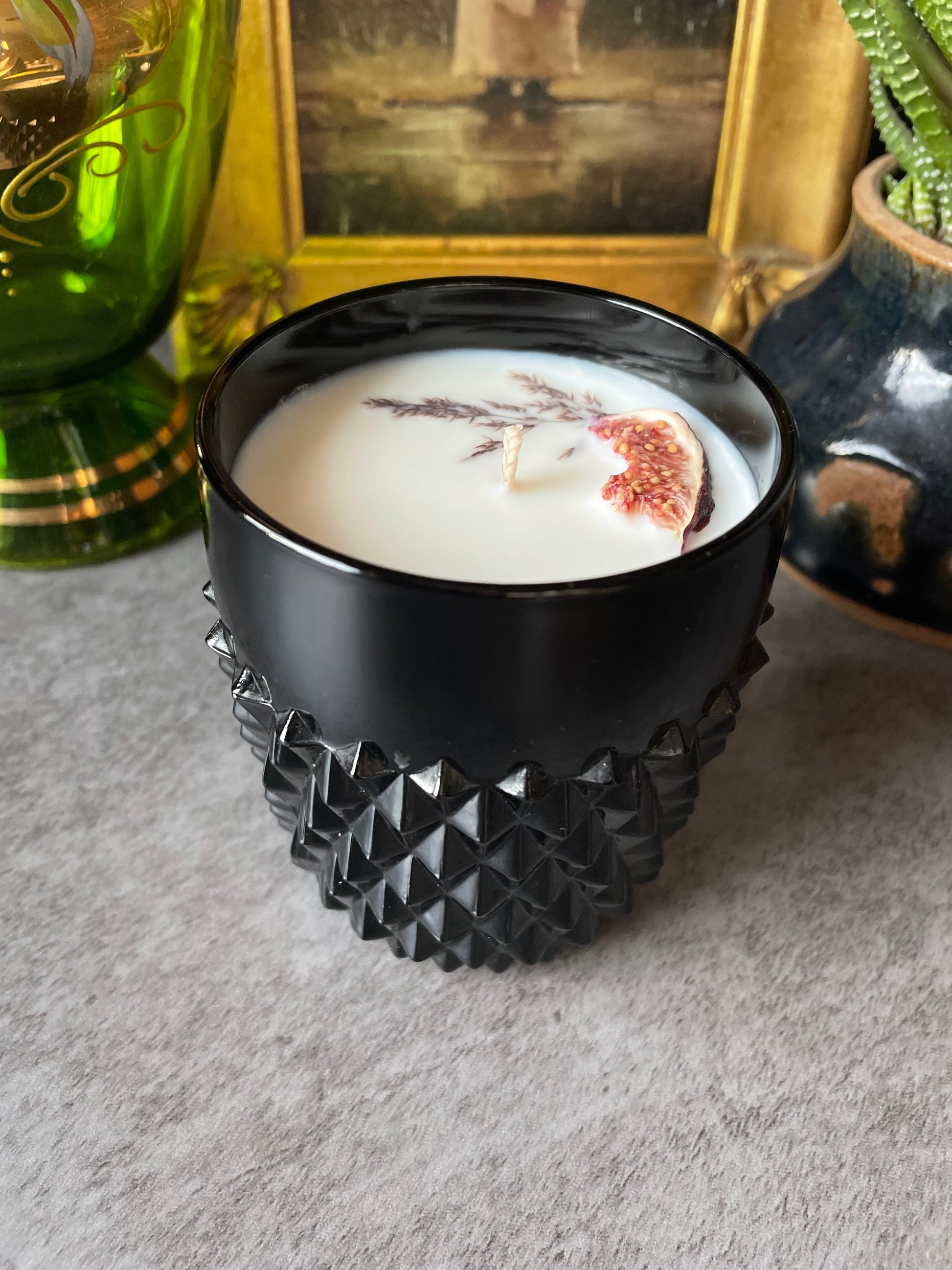 This beautiful vintage Tiara black diamond point glass is filled with our Brown Sugar and Fig scent and is adorned with dried flowers and a dehydrated fig slice.