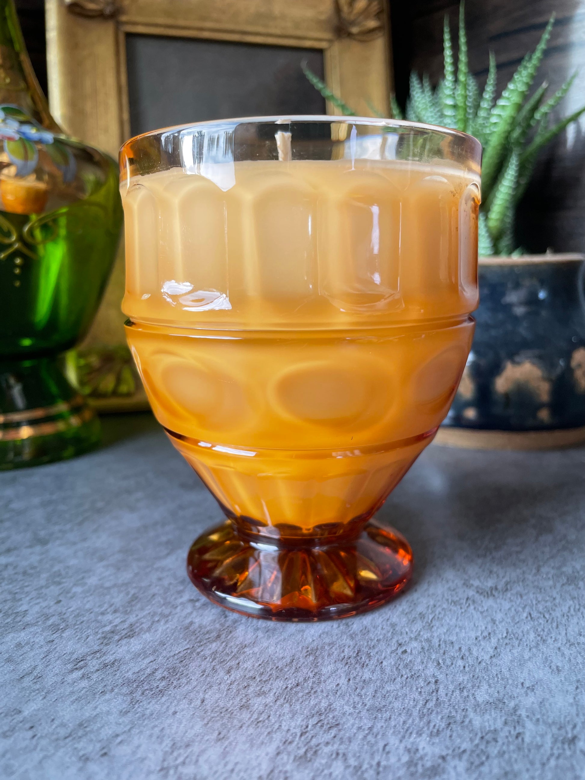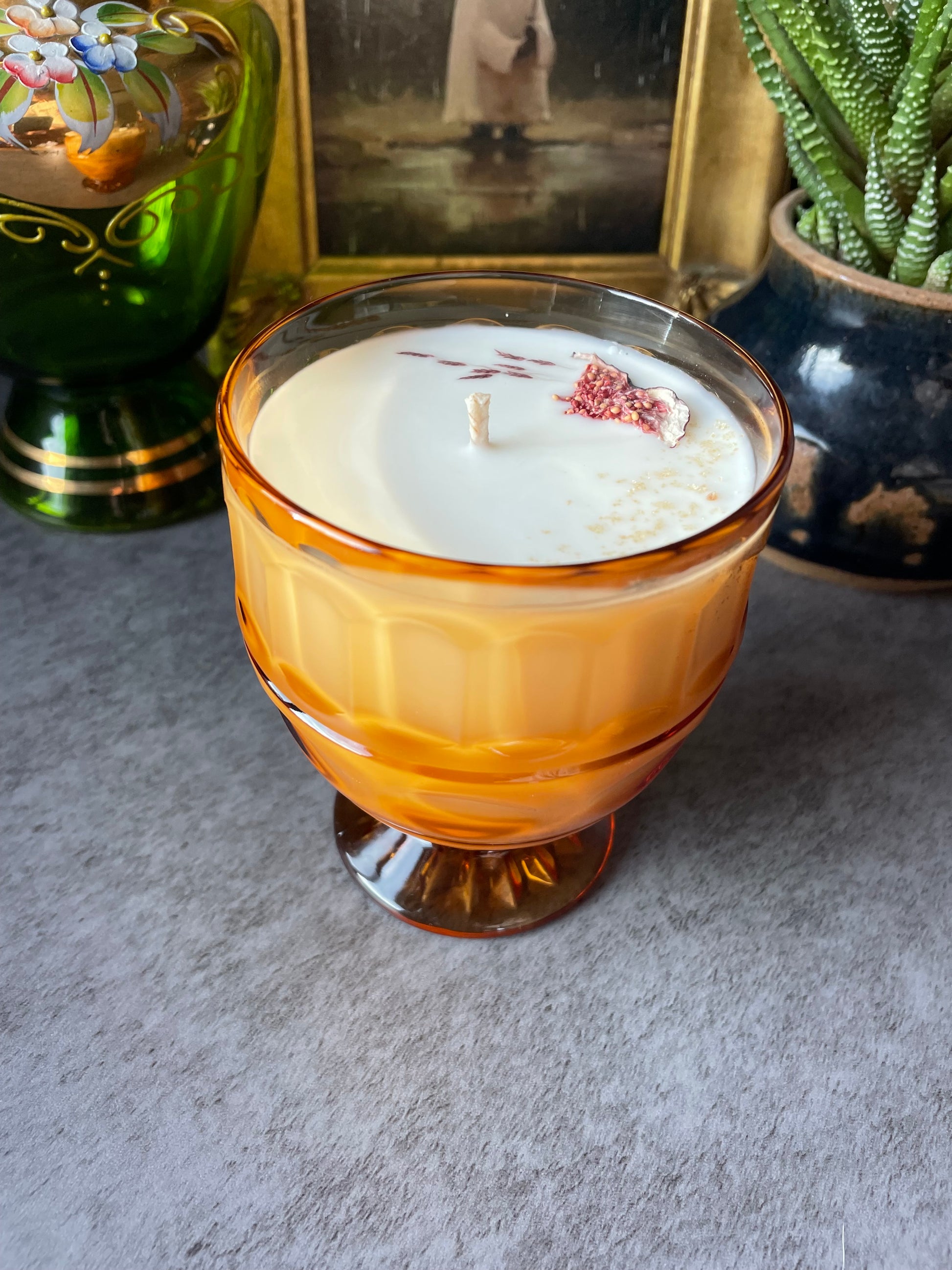 This beautiful vintage amber glass is filled with our Brown Sugar and Fig scent and is adorned with dried flowers, brown sugar, and a dehydrated fig slice.