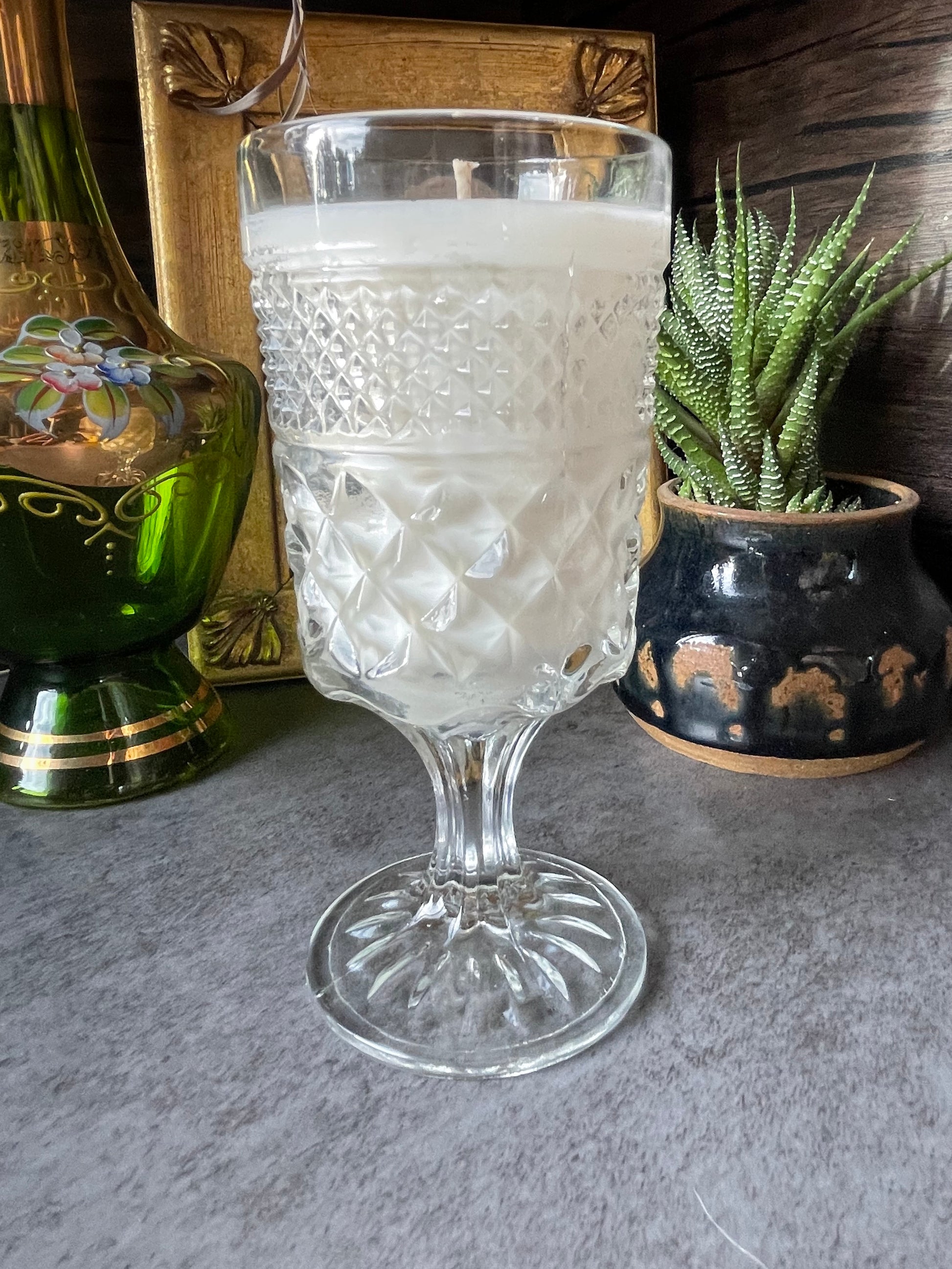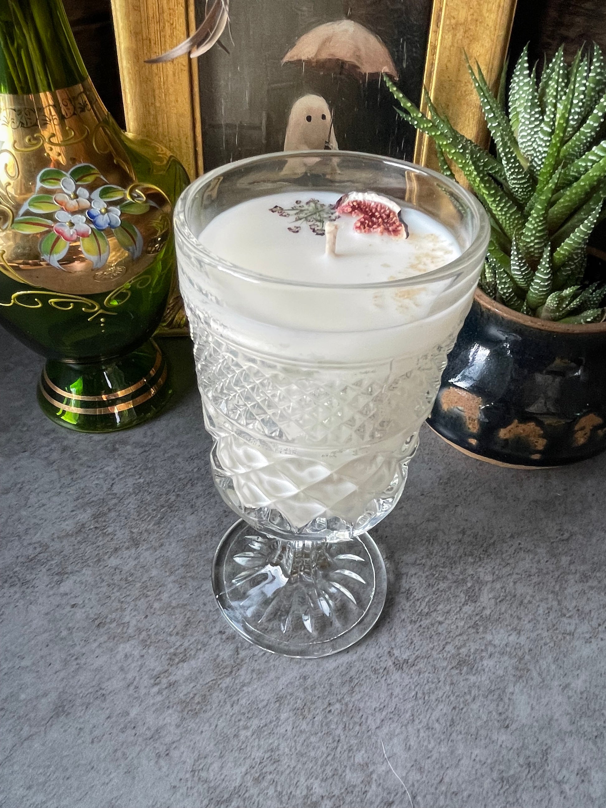 This beautiful vintage glass is filled with our Brown Sugar and Fig scent and is adorned with dried flowers, brown sugar, and a dehydrated fig slice.