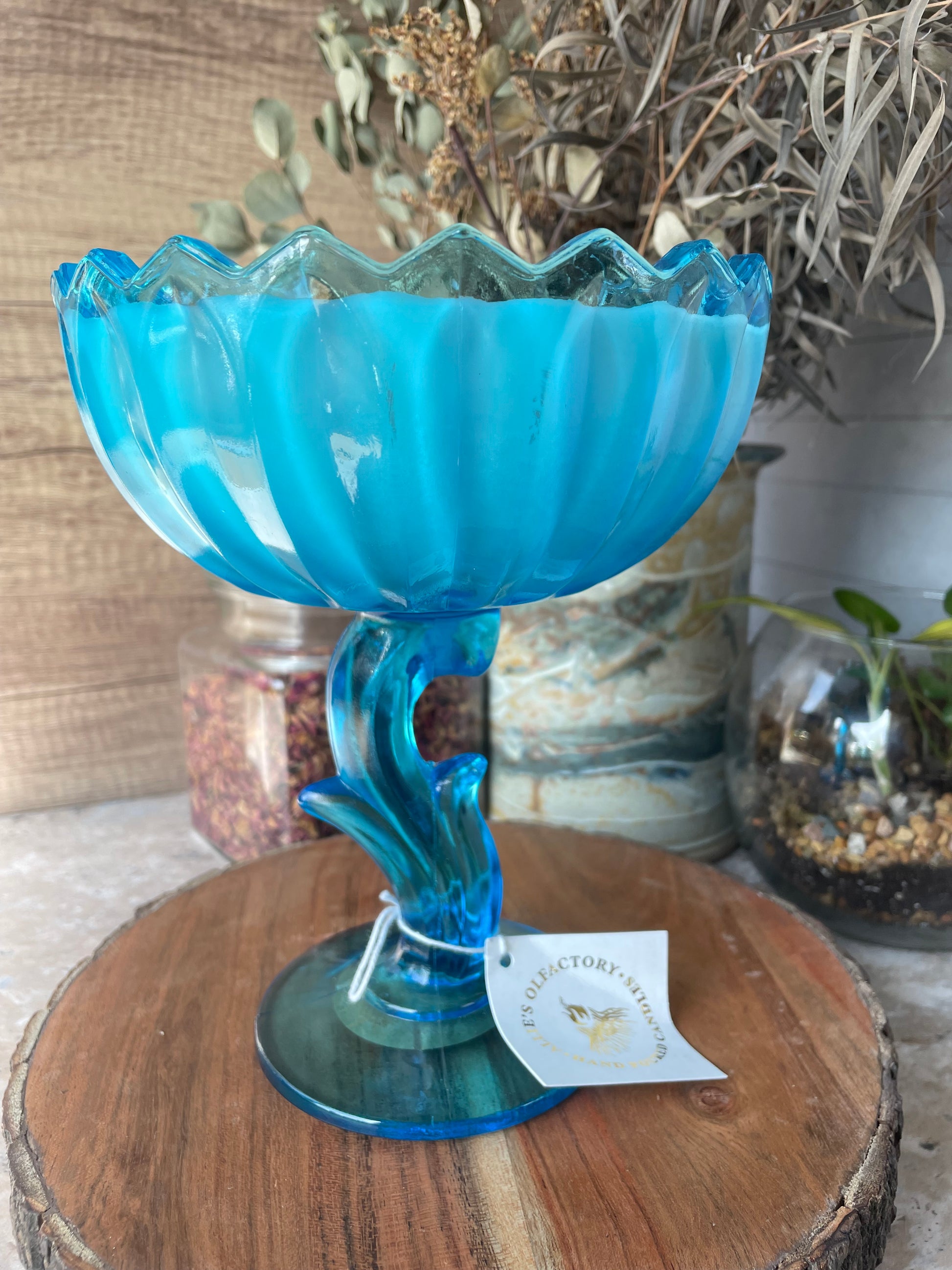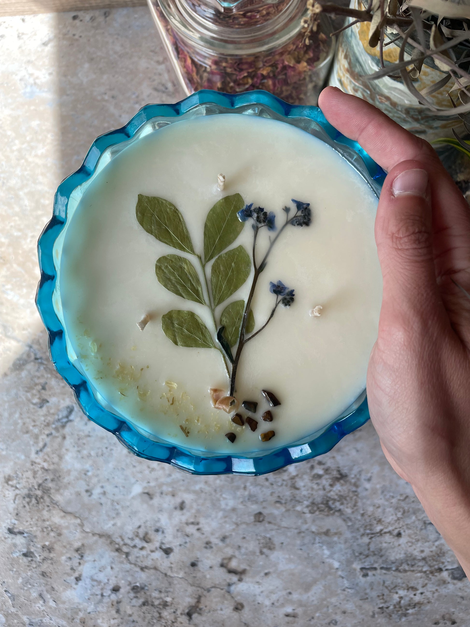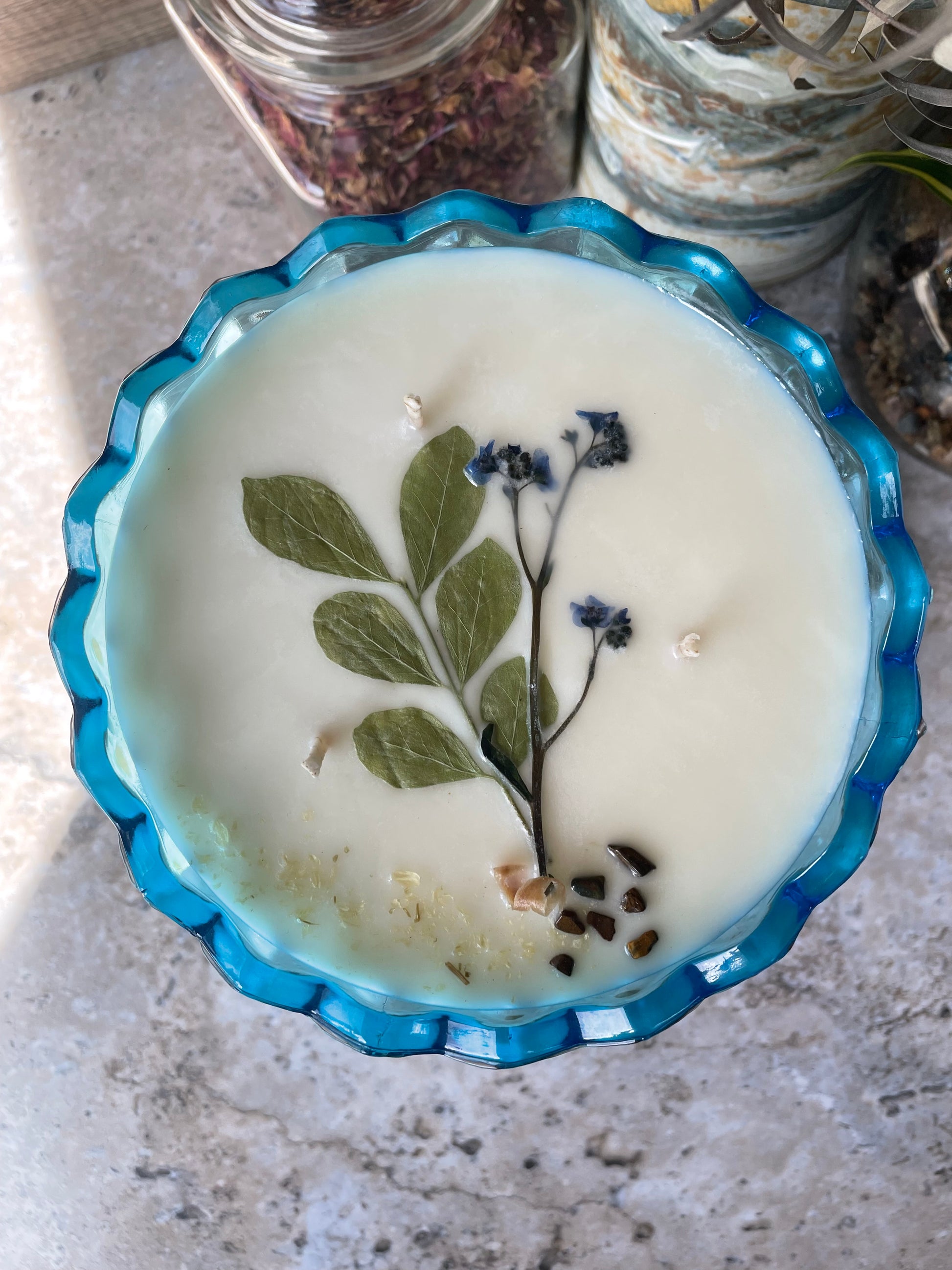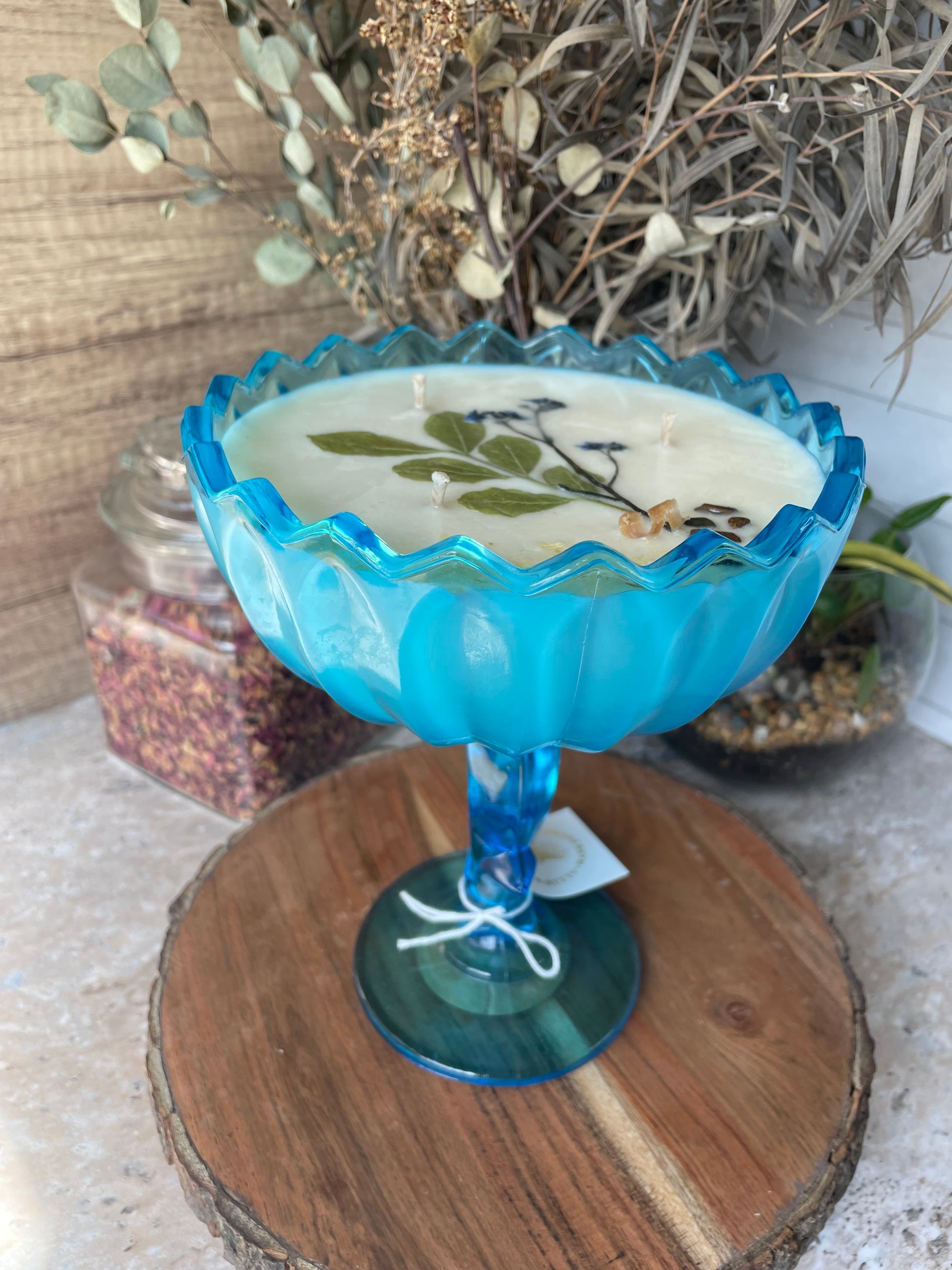 This absolutely gorgeous blue lotus pedestal dish is filled with 22 oz of our Caribbean Ember scent and is adorned with dried flowers, dried greenery, tigers eye stone, and wood shavings.