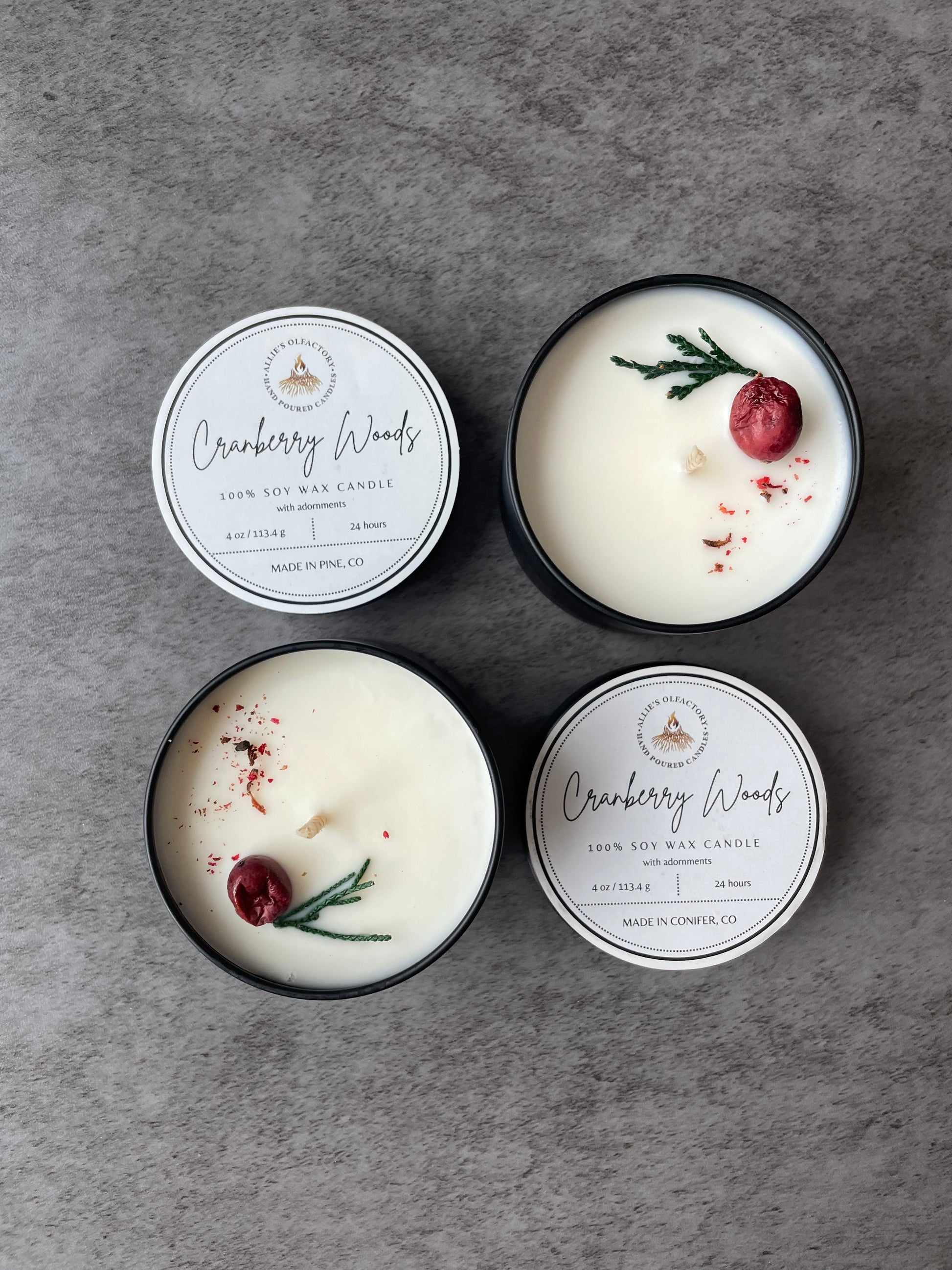 100% Soy Wax tin, Cranberry Woods scent adorned with a dehydrated holly berry, greenery, and crushed pomegranate flowers