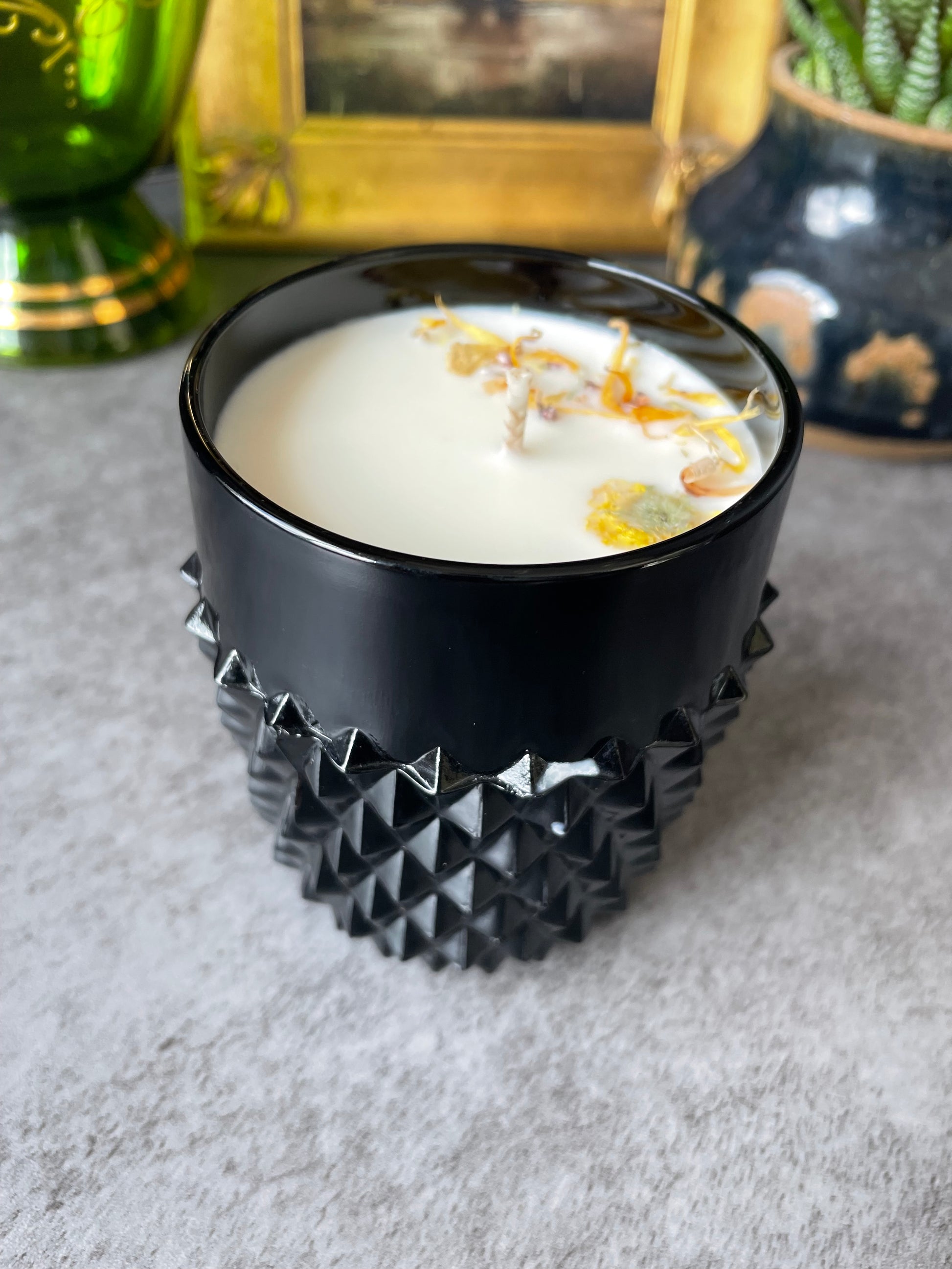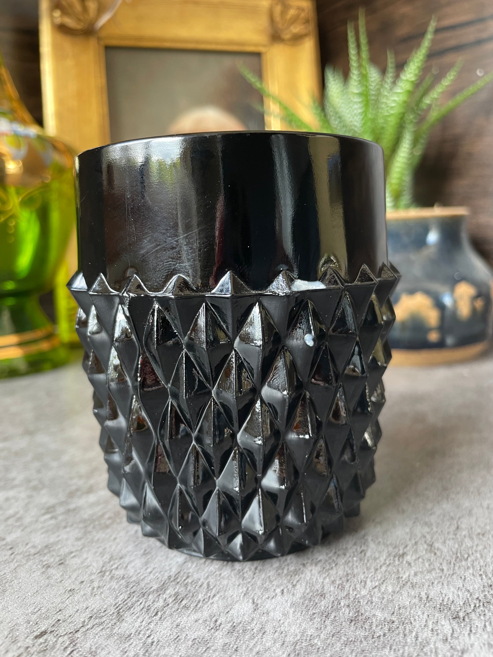This beautiful vintage black Tiara diamond point glass is filled with our Fallen Leaves scent. It is adorned with dried flowers, dried greenery and wood shavings.