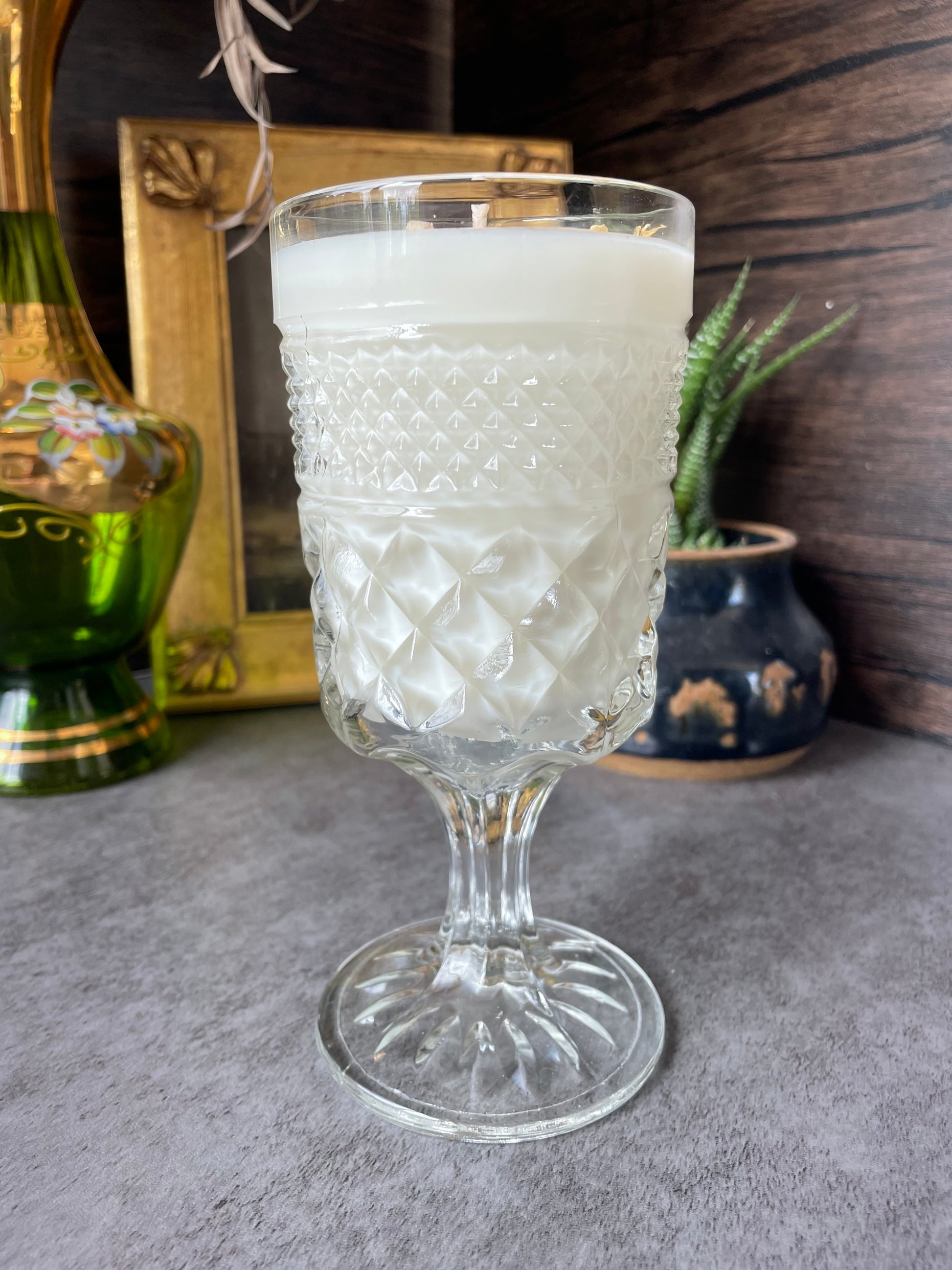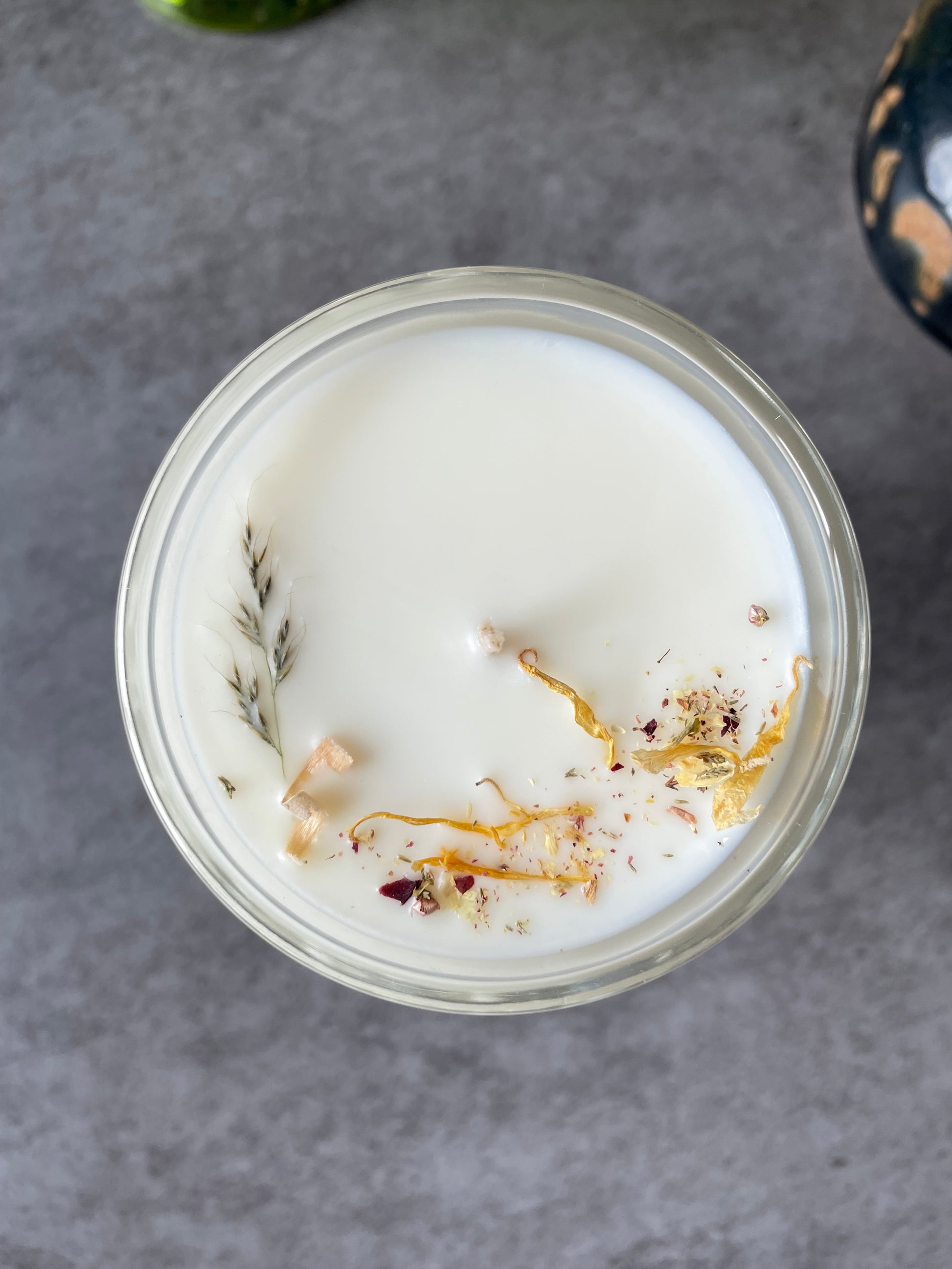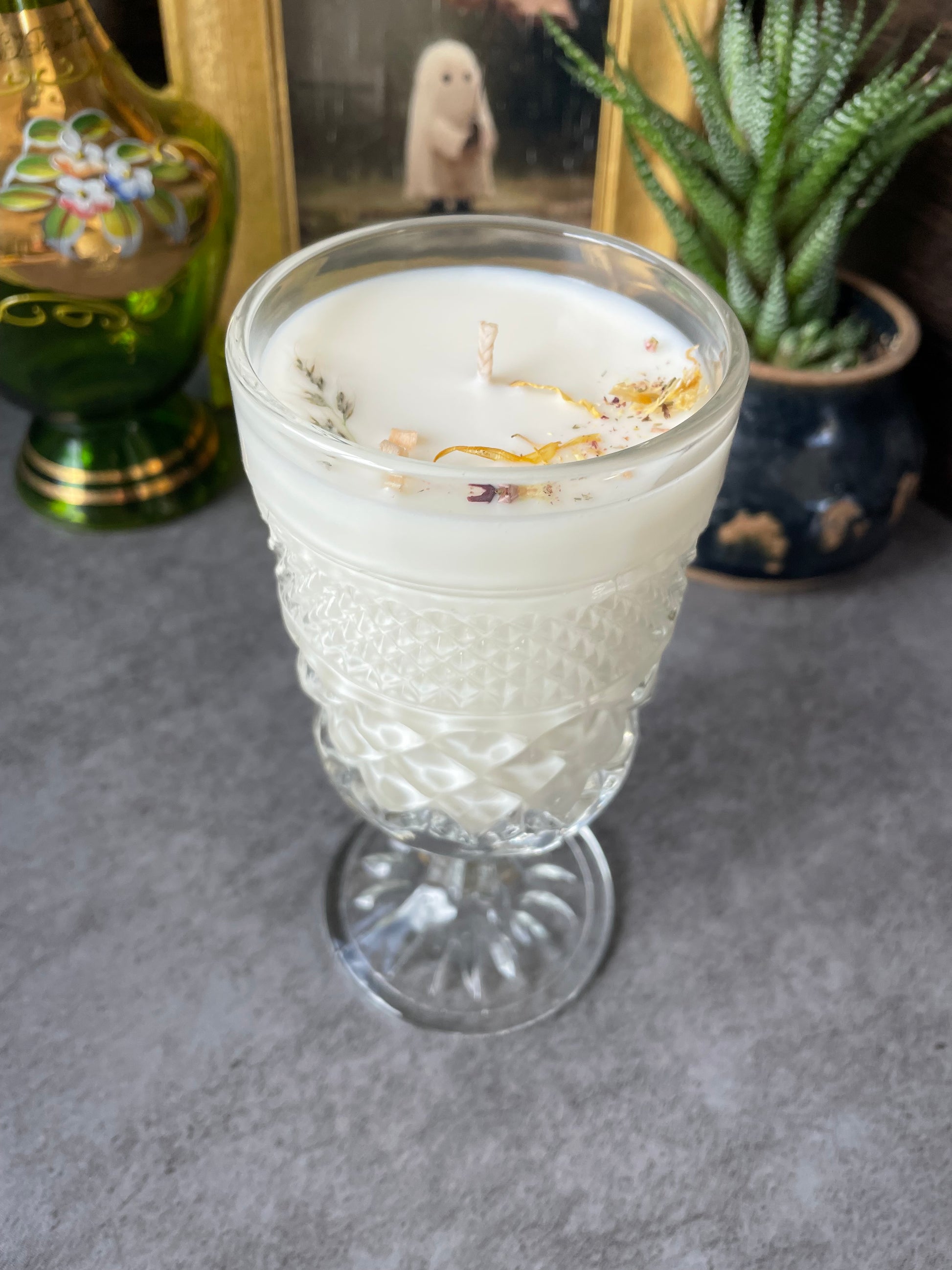 This beautiful vintage glass is filled with our Fallen Leaves scent. It is adorned with dried flowers, dried greenery and wood shavings.