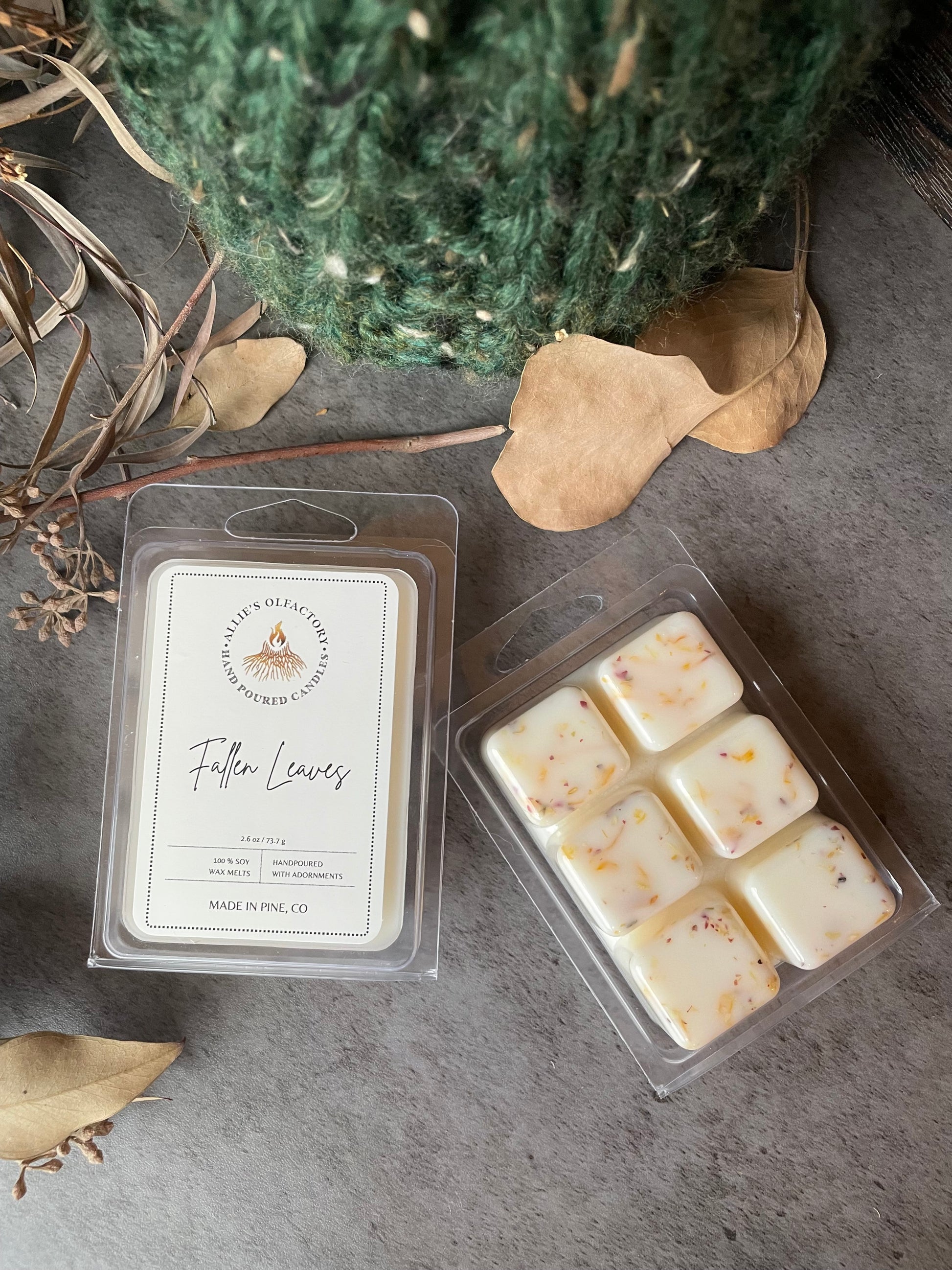 100% Soy Wax melts, Fallen Leaves scent with a collection of dried flowers.