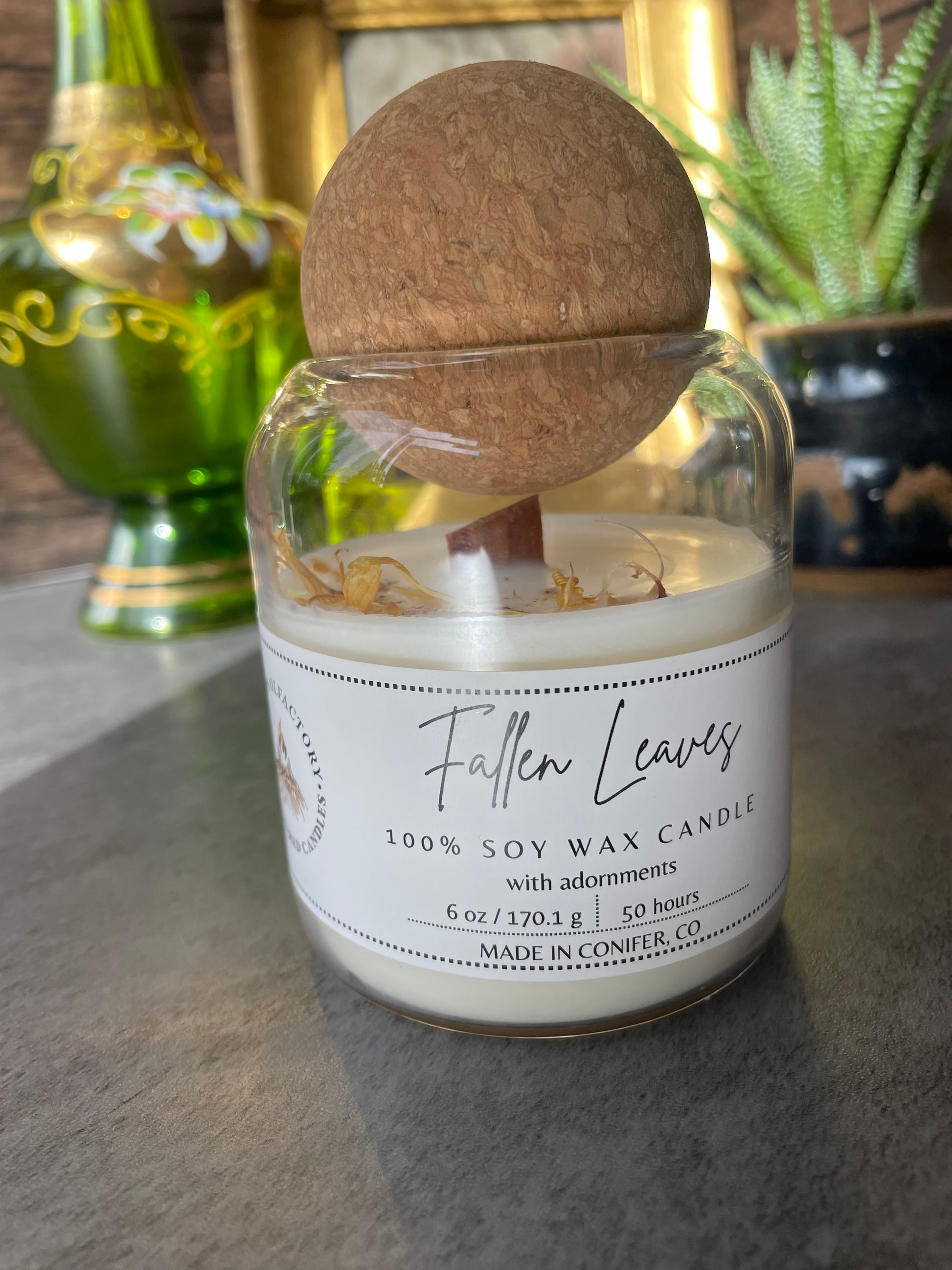 These new wooden wick jars come with a globe shaped cork top and burn for 50 hours. The Fallen Leaves scent is adorned with an assortment of crushed flowers and wood shavings.