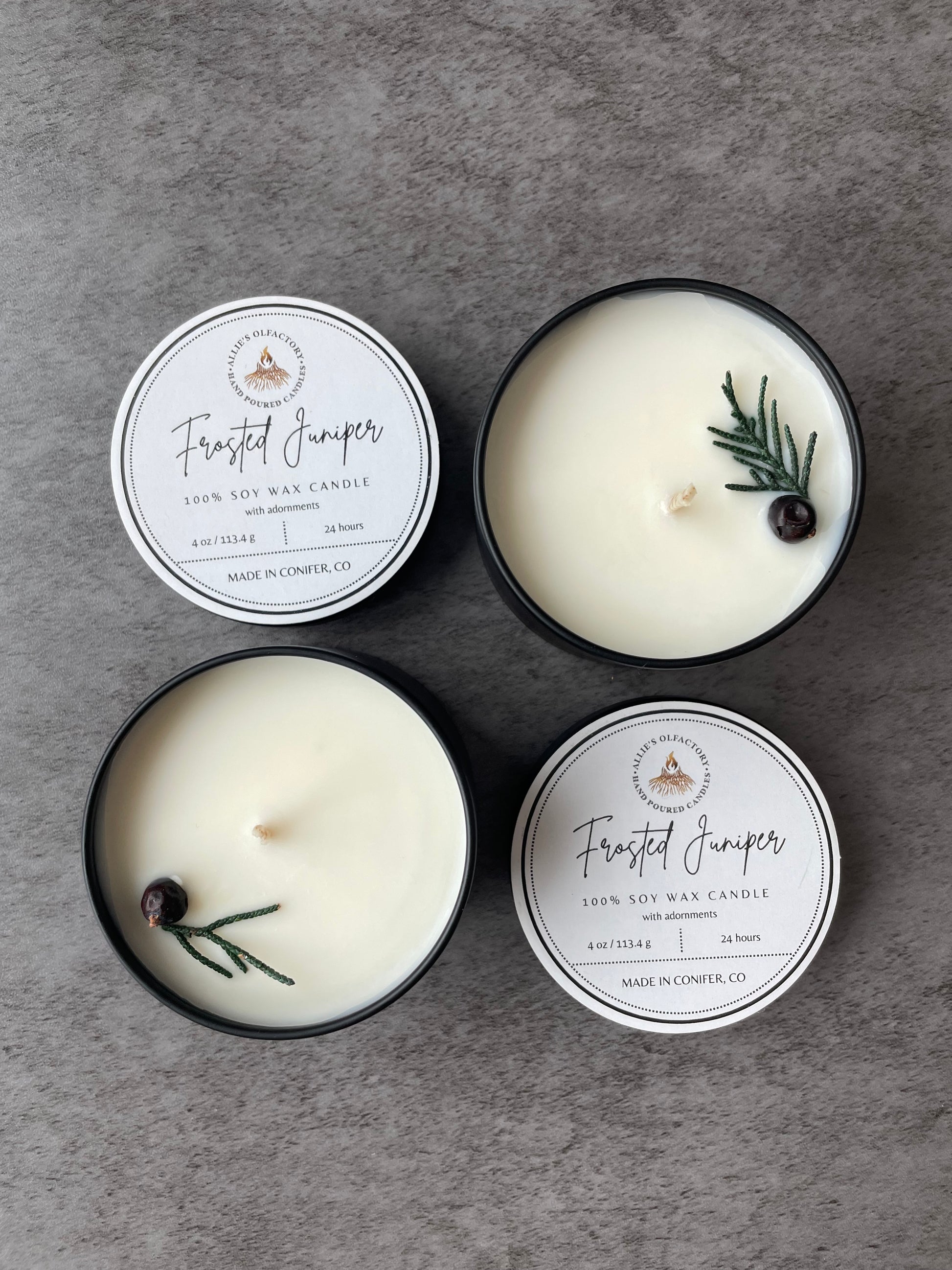 100% Soy Wax tin, Frosted Juniper scent adorned with a juniper sprig