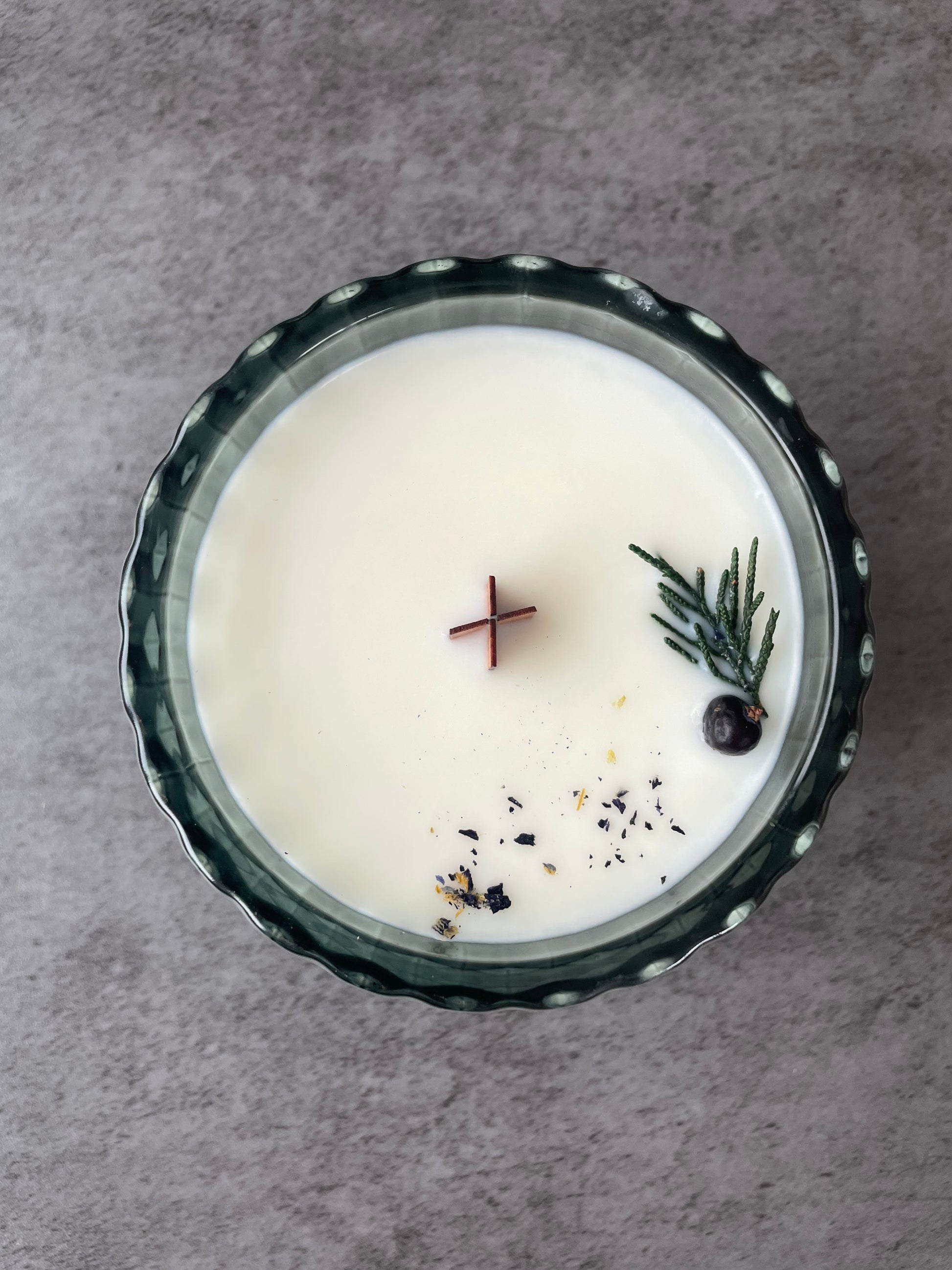 This fresh, cool scent has a base of juniper and sage smells and hints of pine, cherry blossom, and red currant. It is poured into a translucent blue vessel and adorned with a juniper sprig and berry as well as dried butterfly pea flowers. The crackling X wooden wick is a showstopper!