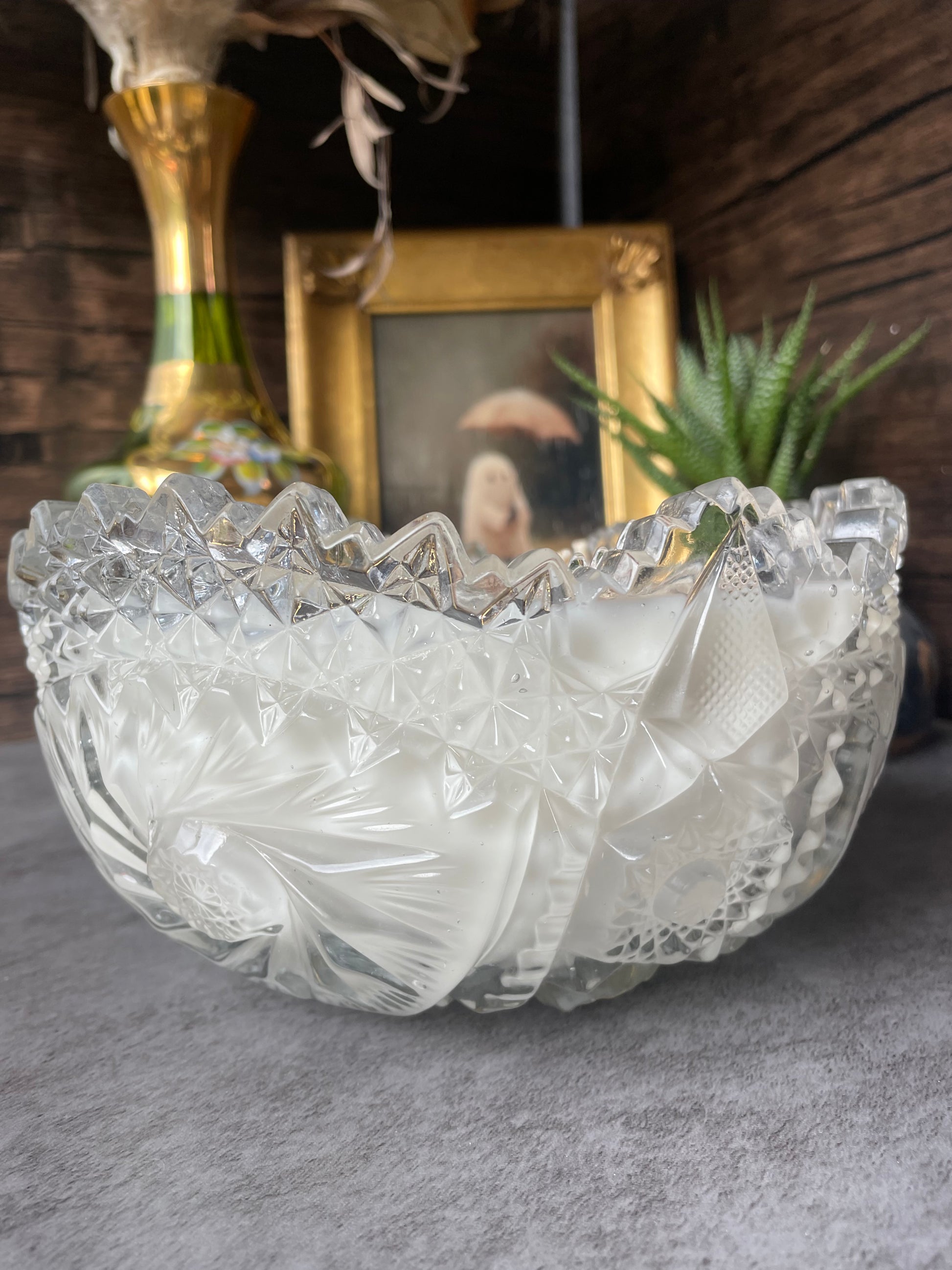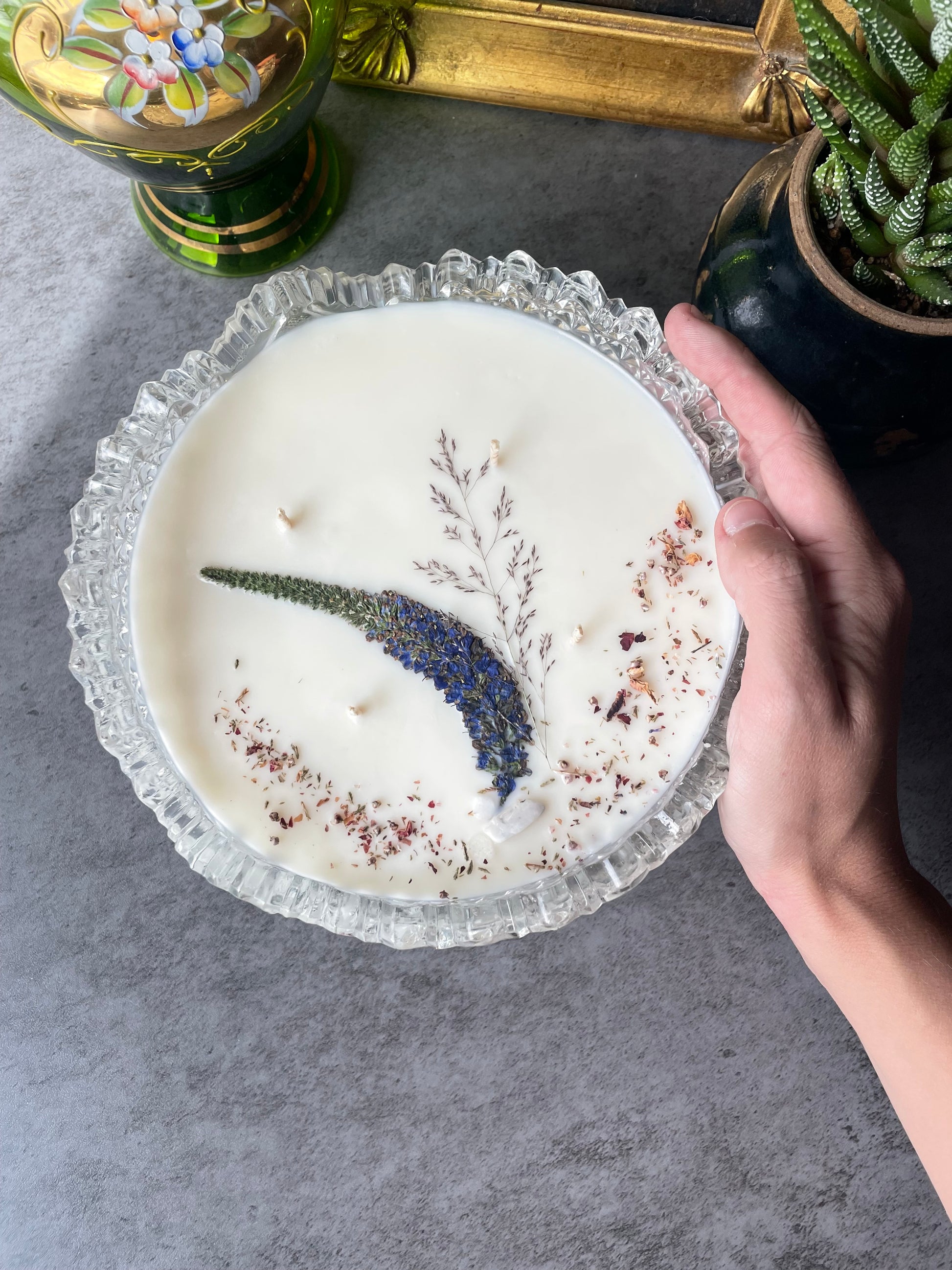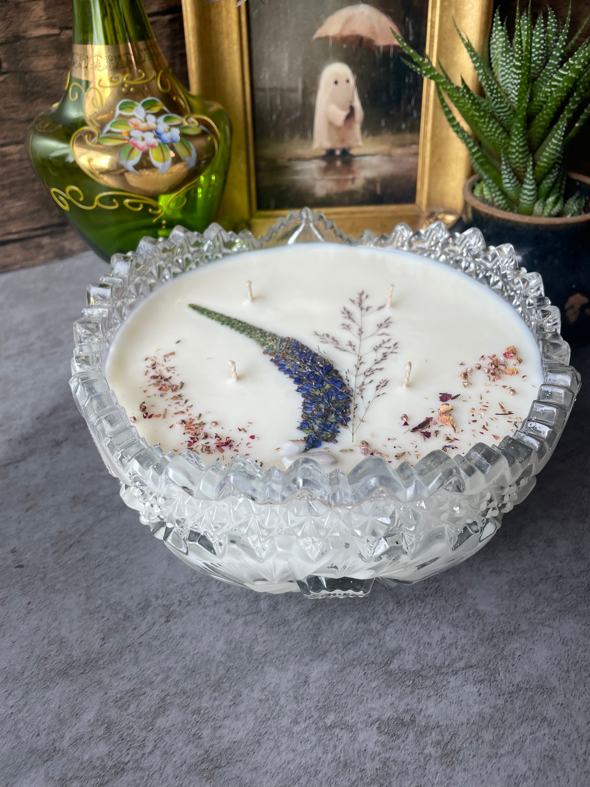 This sturdy, massive vintage glass bowl is filled with our Harvest Moon scent and is adorned with dried flowers, dried greenery, and moon stone pieces.