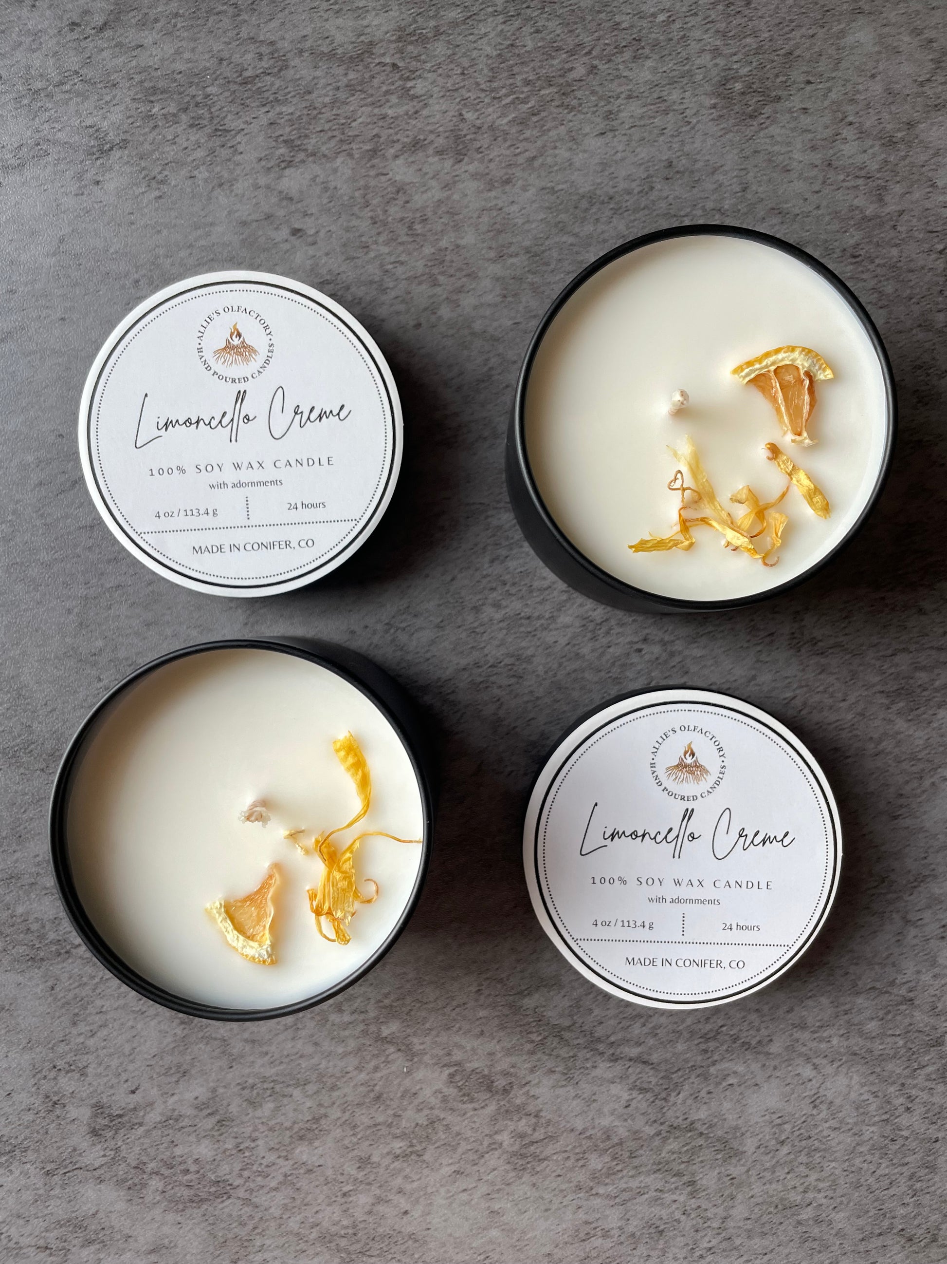 100% Soy Wax tin, Limoncello Creme scent adorned with a dehydrated lemon slice and calendula petals