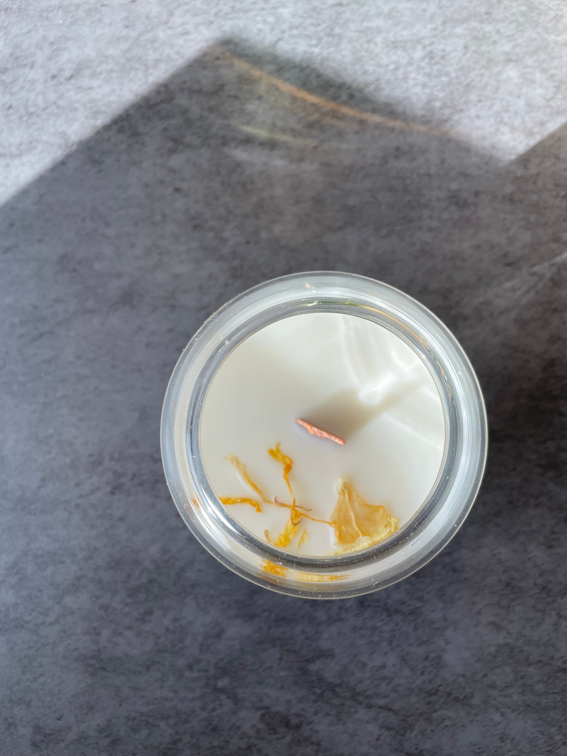 These beautiful wooden wick jars come with a globe shaped cork top and burn for 50 hours. The Limoncello Crème scent is adorned with a dehydrated lemon slice and dried calendula petals.