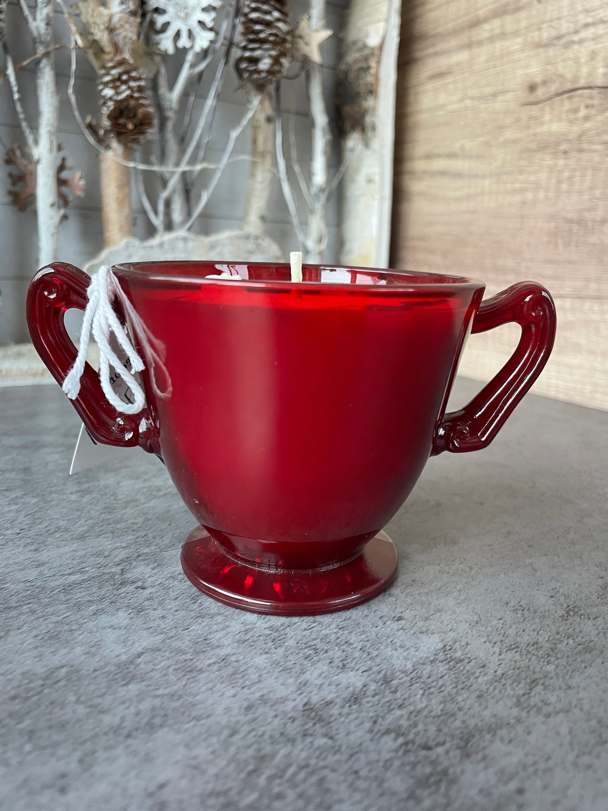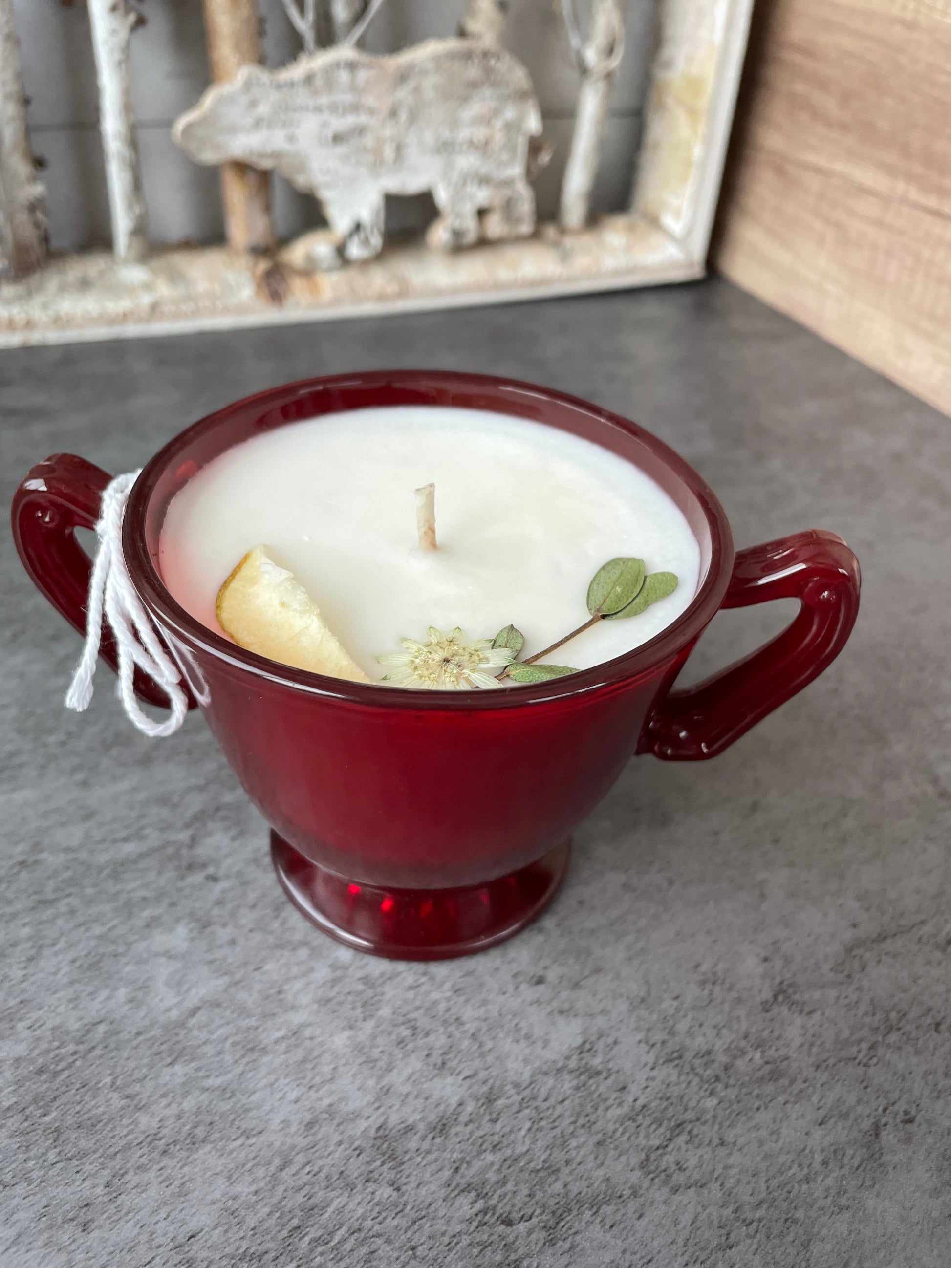 This beautiful red sugar dish is filled with our Moonflower Grove scent and is adorned with dried greenery, dried flowers, and a dehydrated pear slice.