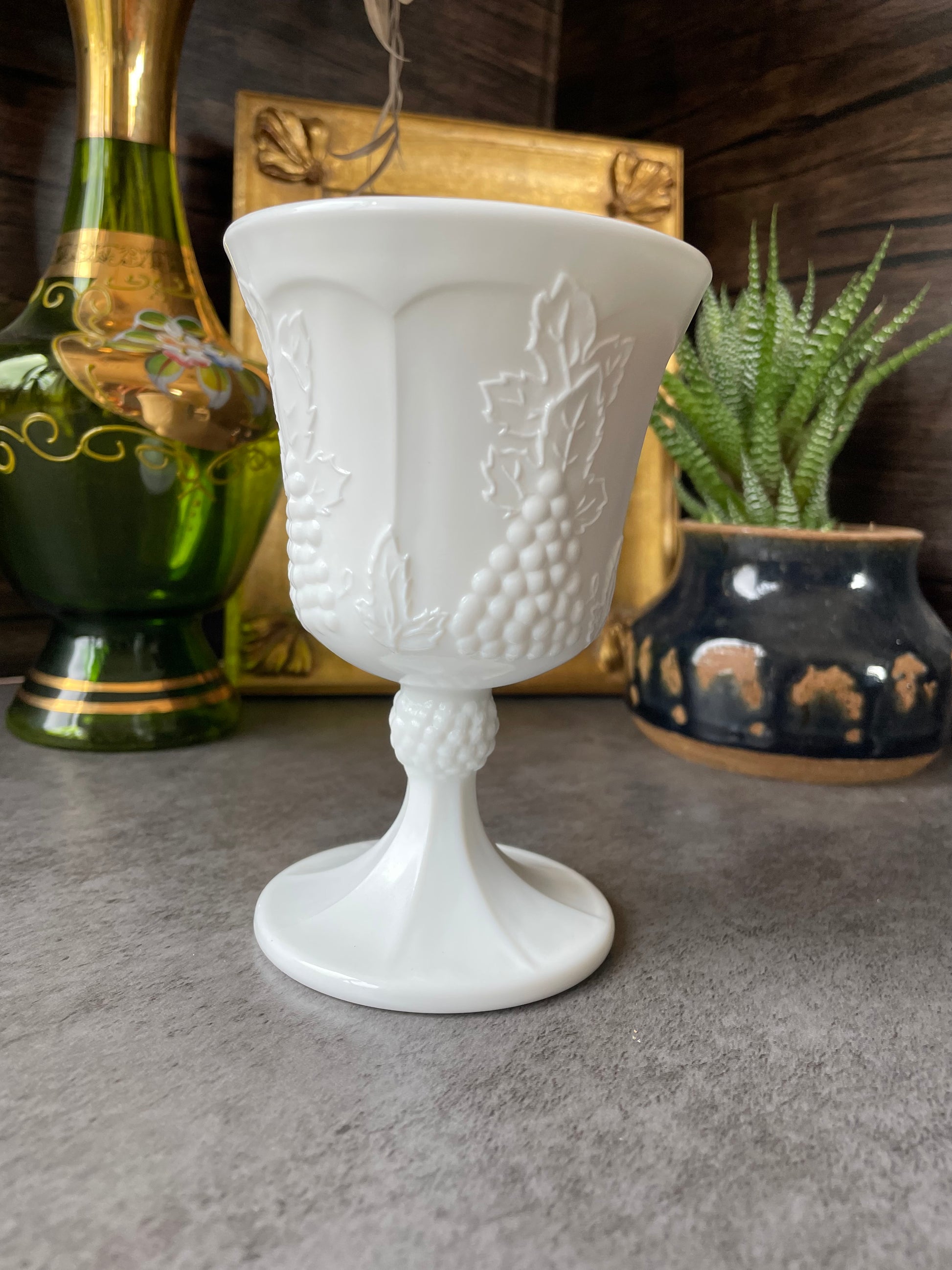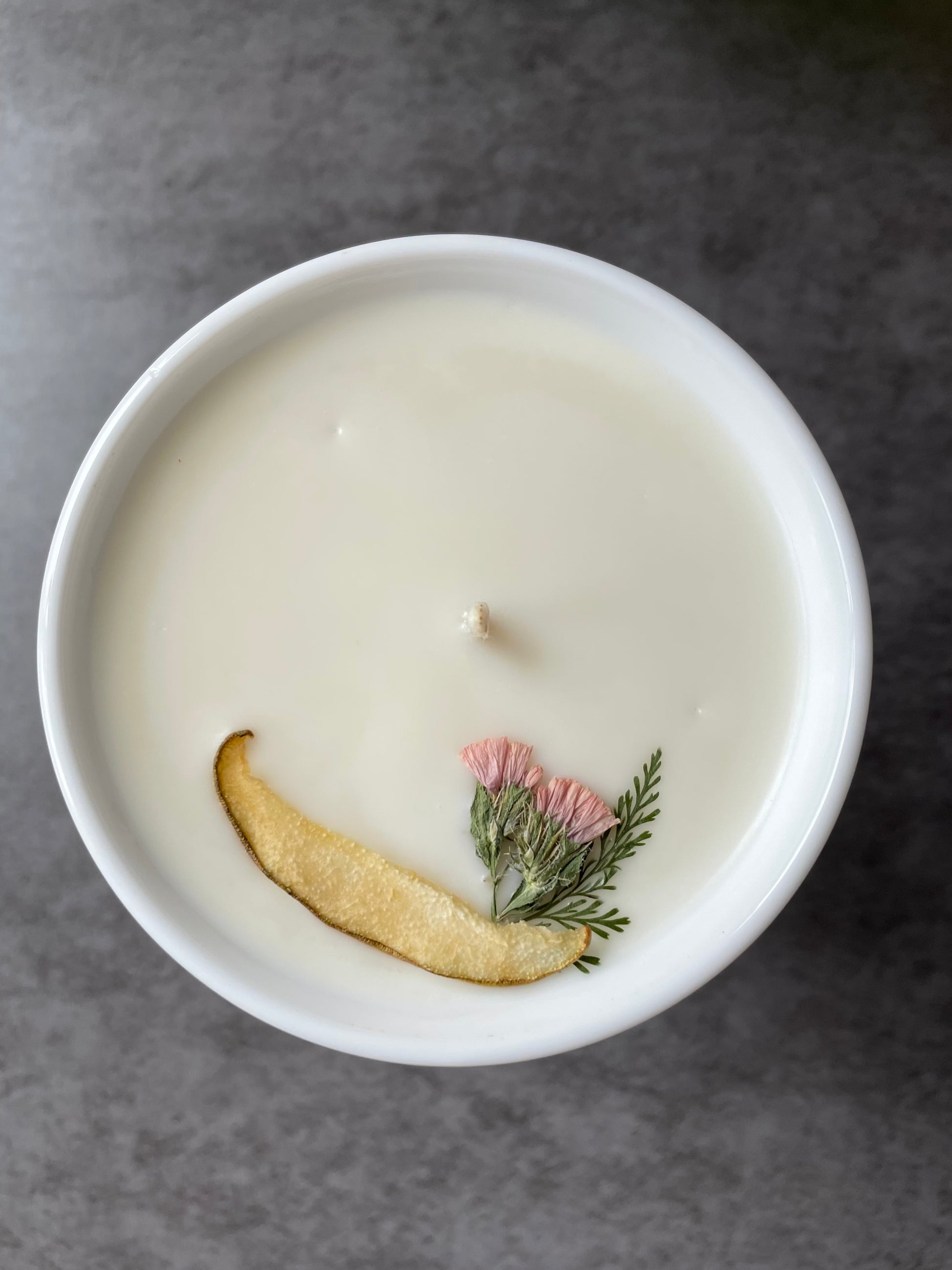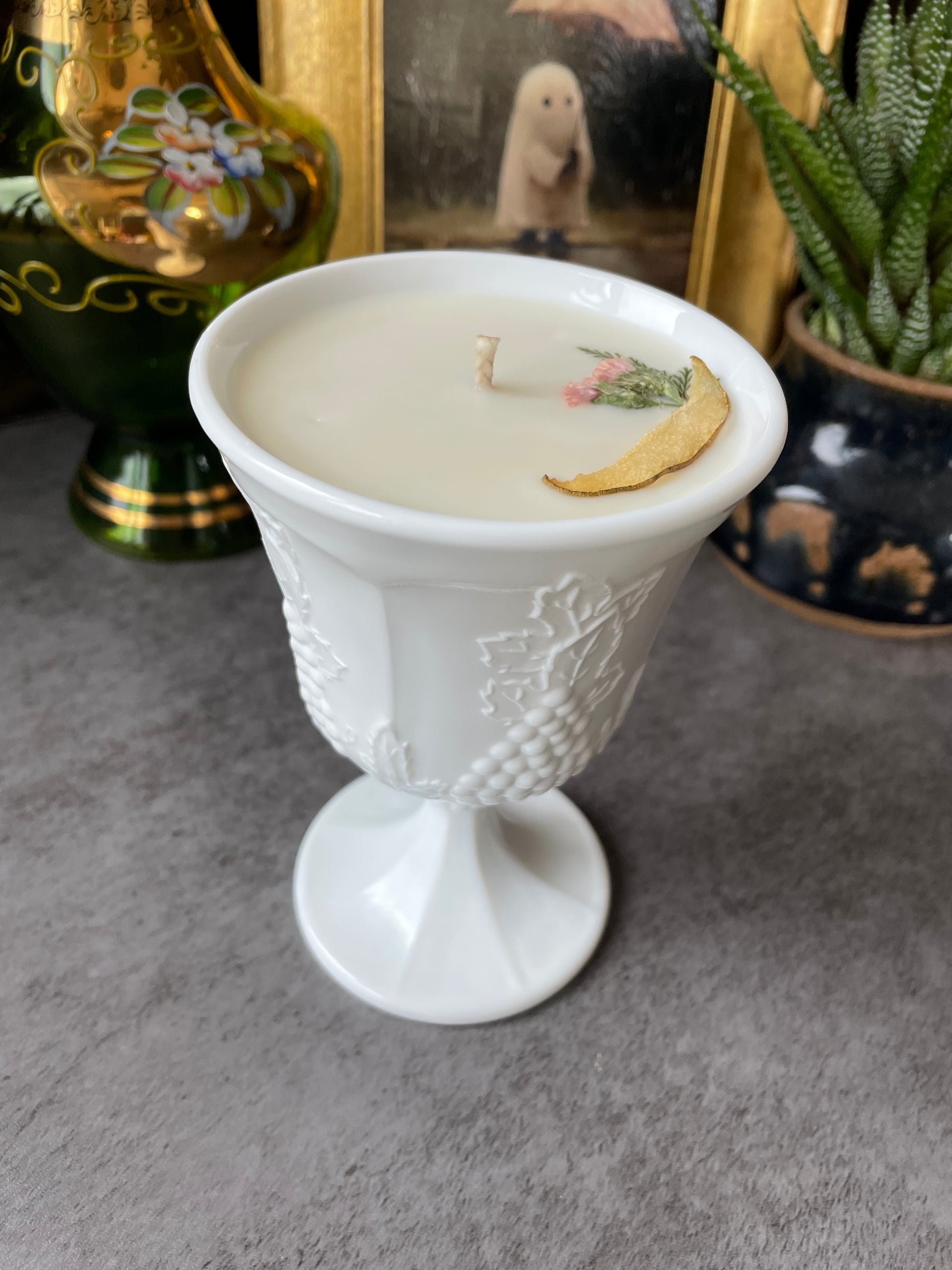 This beautiful vintage milk glass chalice is filled with our Moonflower Grove scent and is adorned with dried greenery, dried flowers, and a dehydrated pear slice.