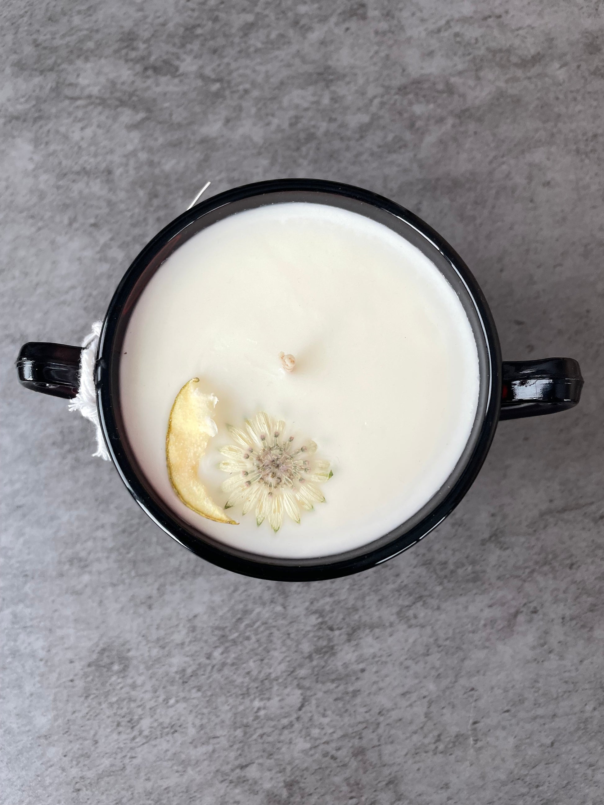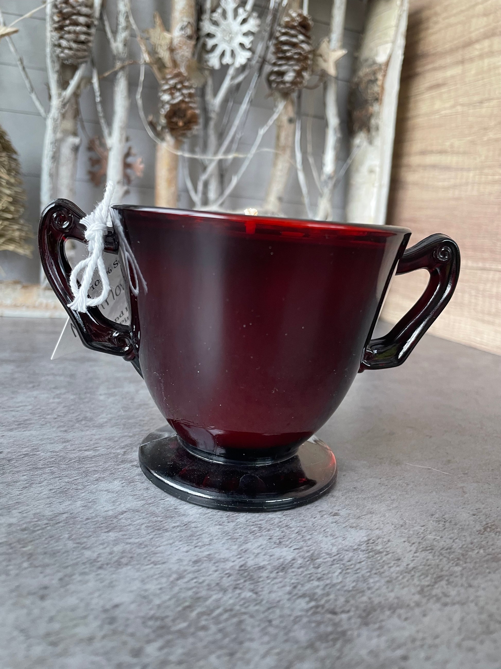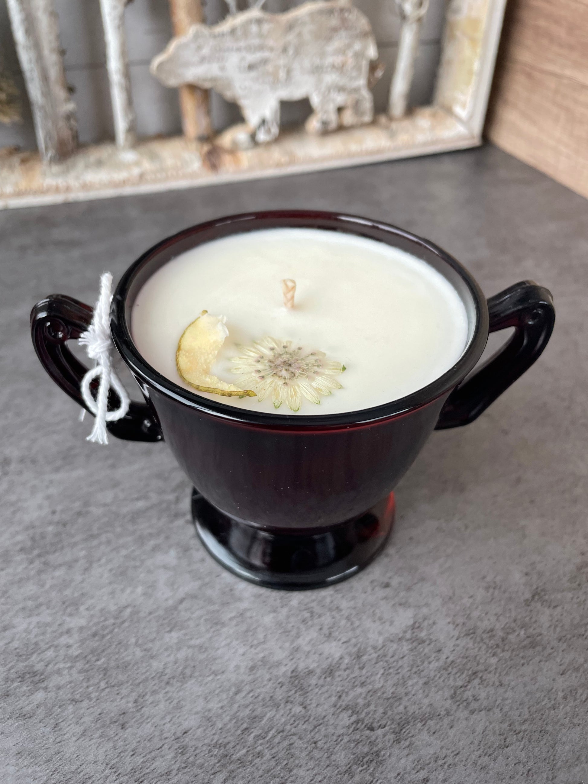 This beautiful deep red vintage sugar dish is filled with our Moonflower Grove scent and is adorned with dried flowers and a dehydrated pear slice.