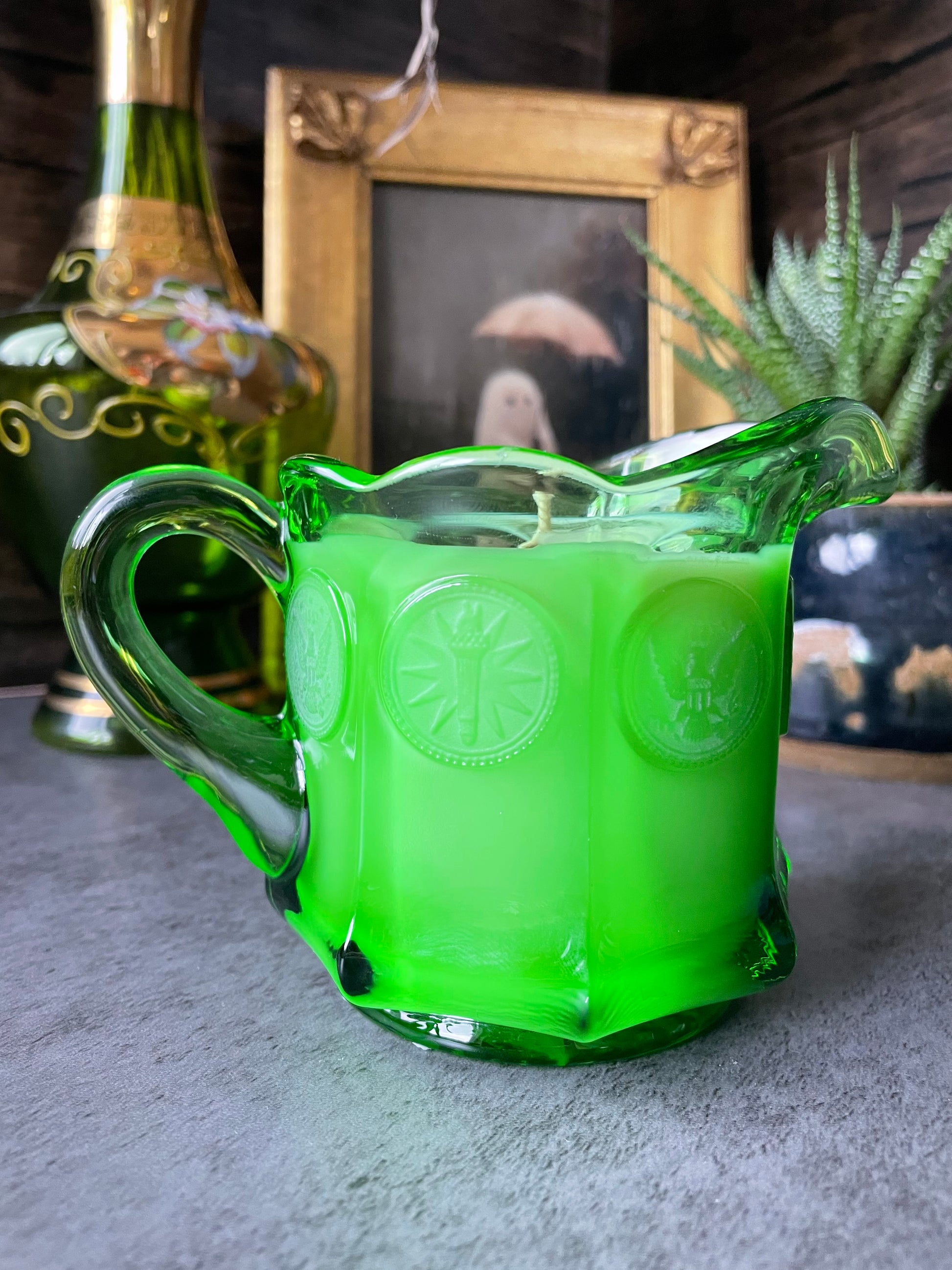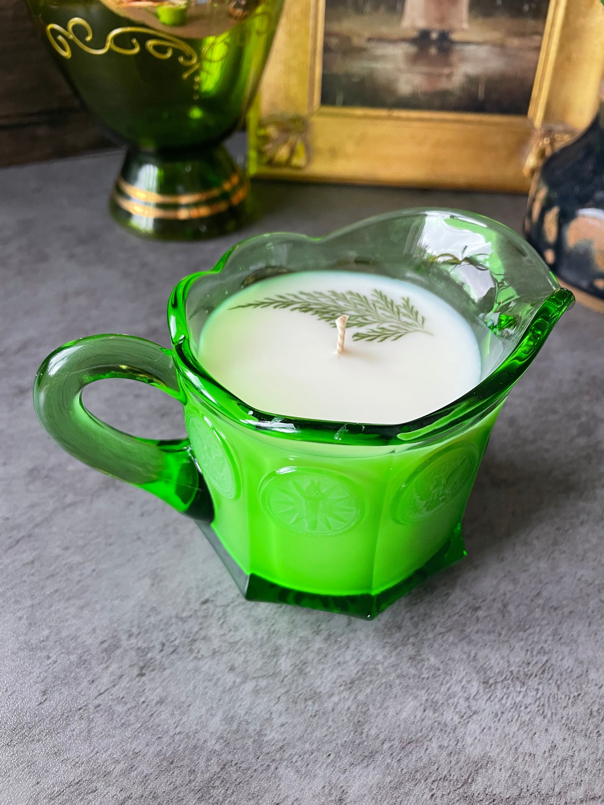 This vintage green creamer dish is filled with our Mountain Pine scent and is adorned with dried greenery.