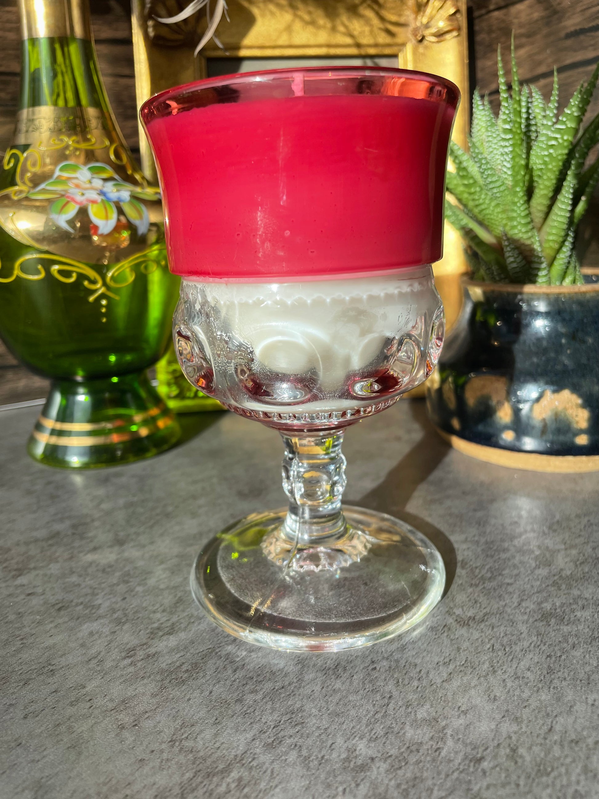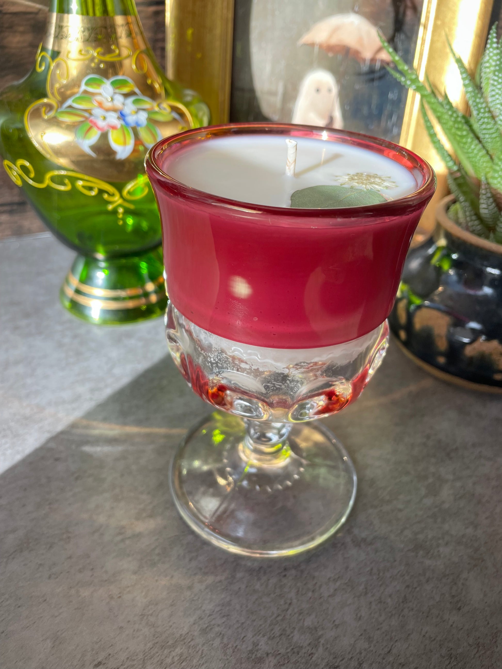 This beautiful vintage kings crown thumbprint glass is filled with our Peppermint and Eucalyptus scent and adorned with dried eucalyptus and dried flowers.