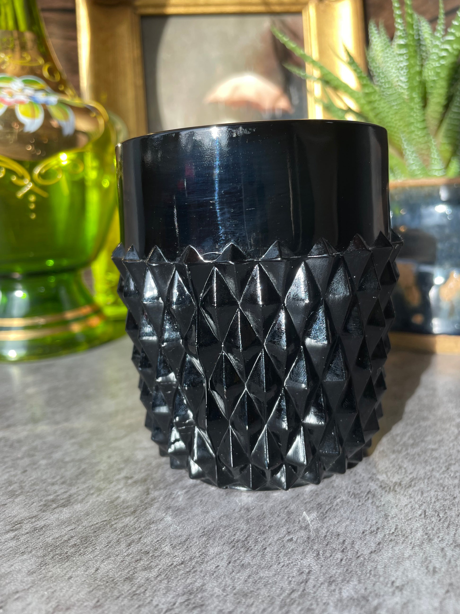 This gorgeous vintage black Tiara diamond point glass is filled with our Peppermint and Eucalyptus scent and adorned with dried eucalyptus and dried flowers.