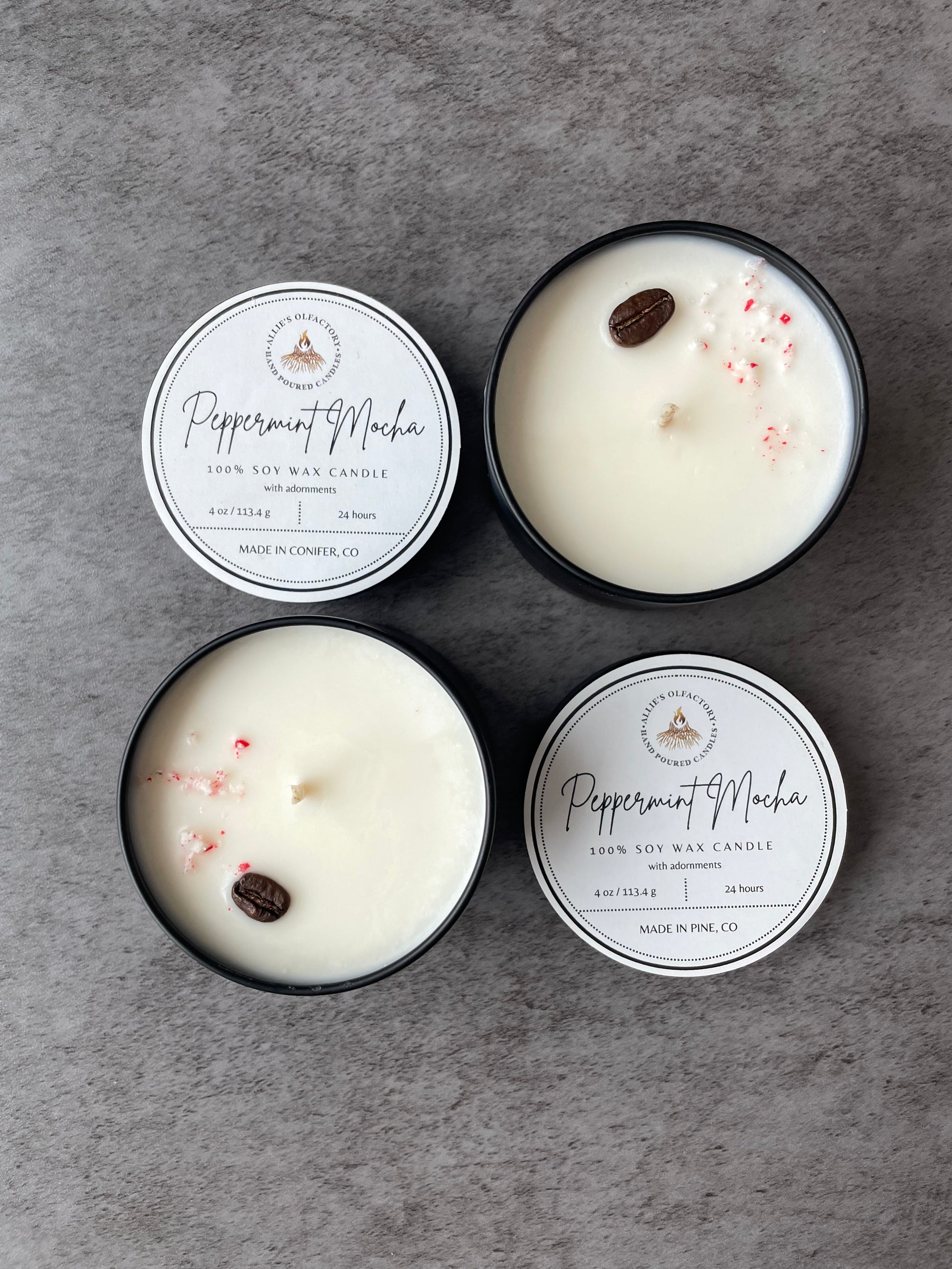 100% Soy Wax tin, Peppermint Mocha scent adorned with coffee grounds, coffee beans, and crushed peppermint