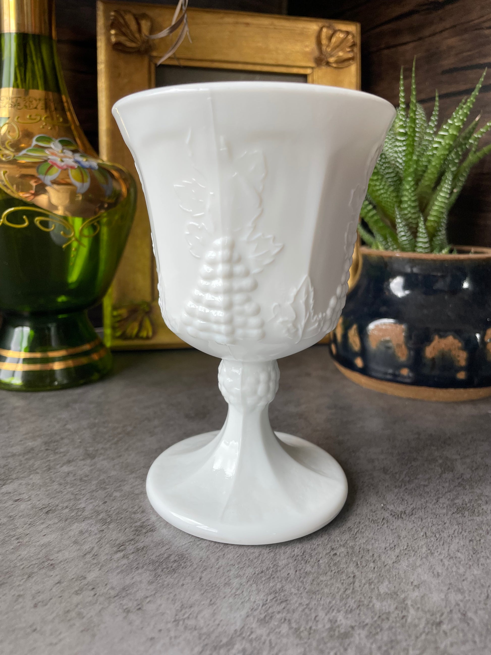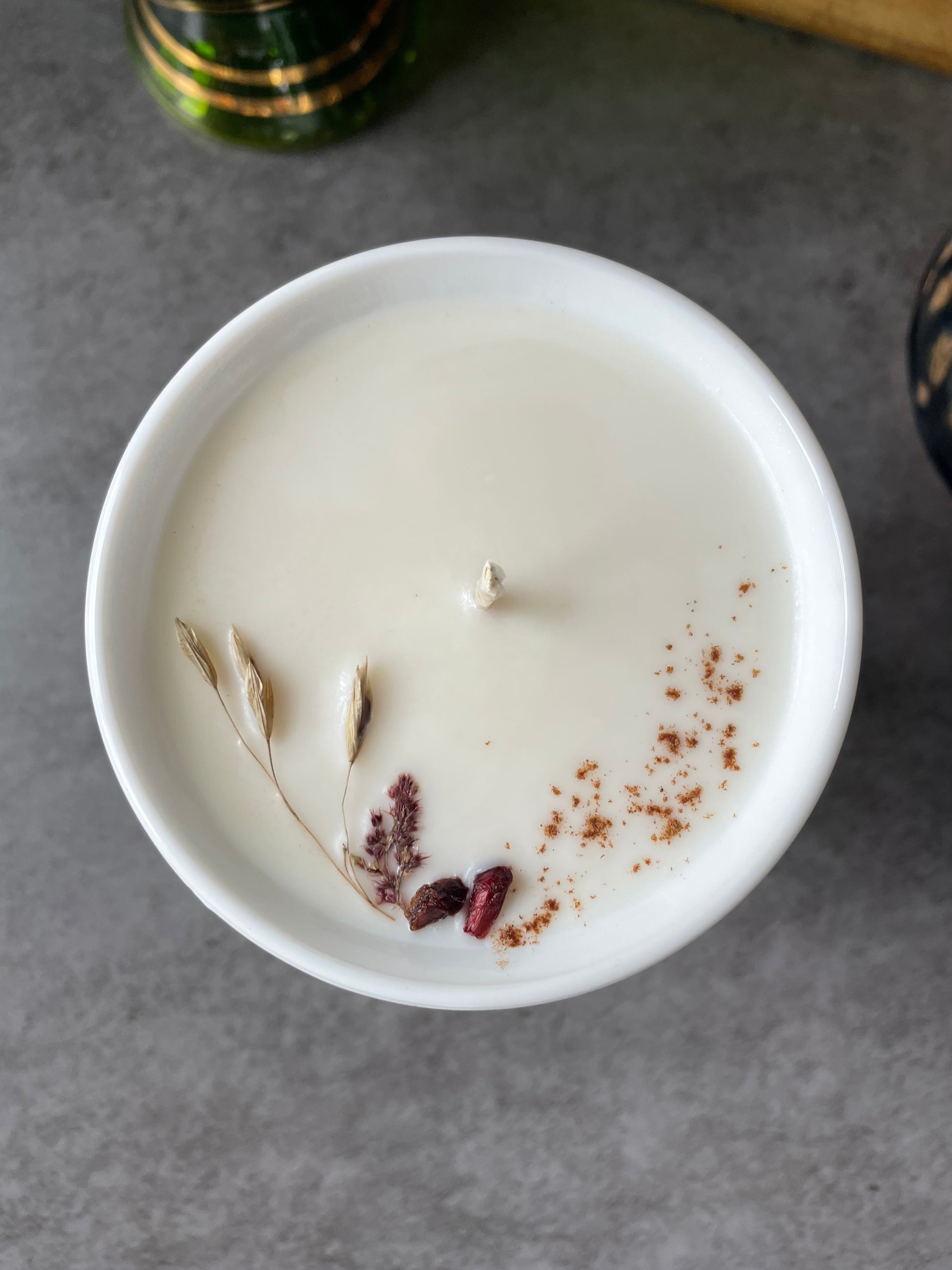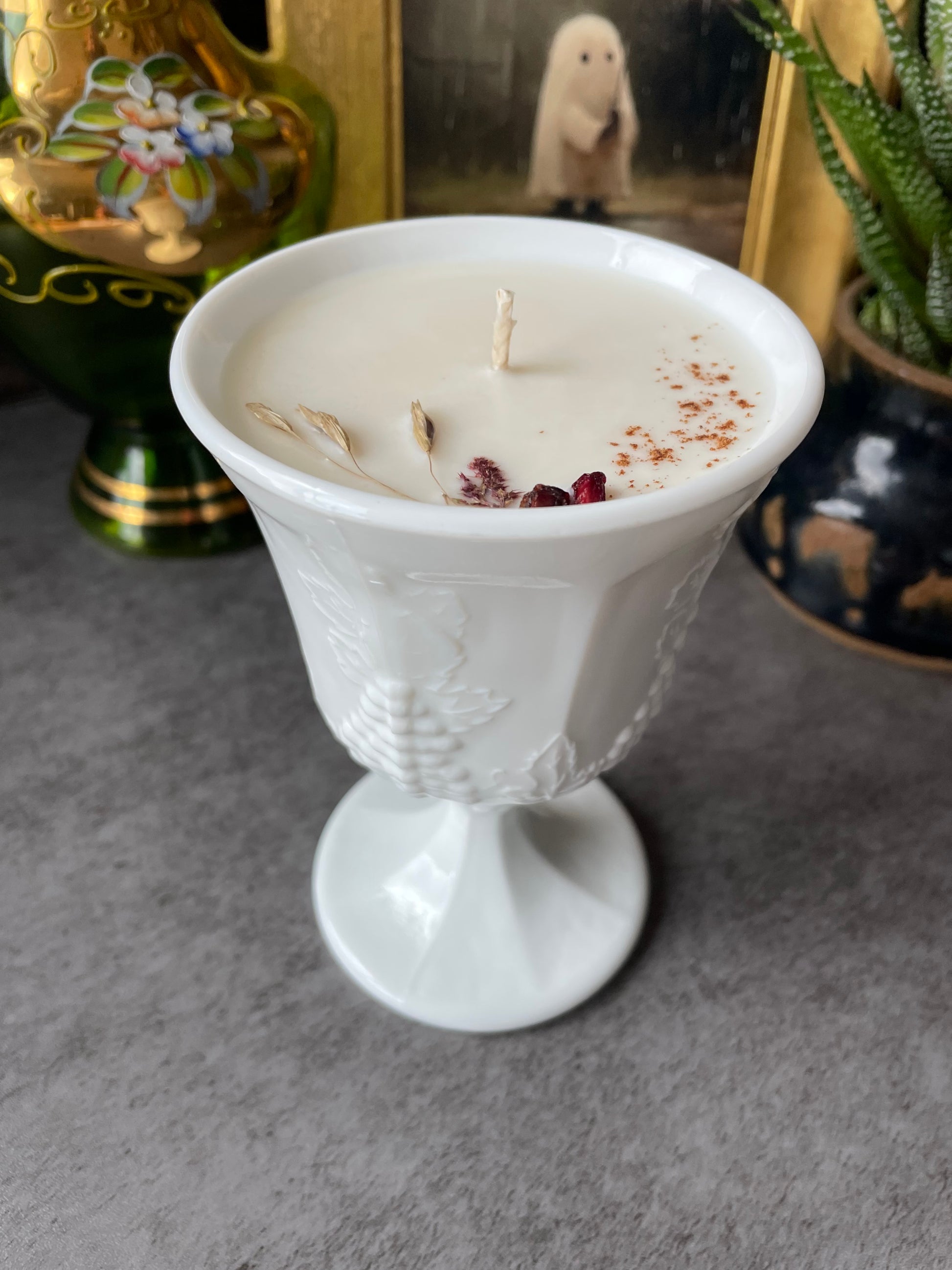This classic vintage milk glass chalice is filled with our Pomegranate Cider scent. It is adorned with dried flowers, dried wheatgrass, dehydrated pomegranate seeds, and cinnamon spice.