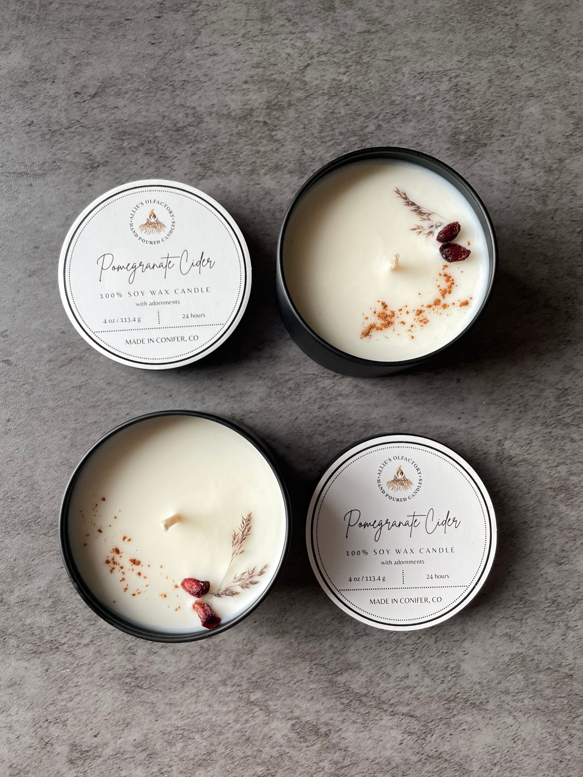 100% Soy Wax tin, Pomegranate Cider scent adorned with dehydrated pomegranate seeds, and cinnamon spice.