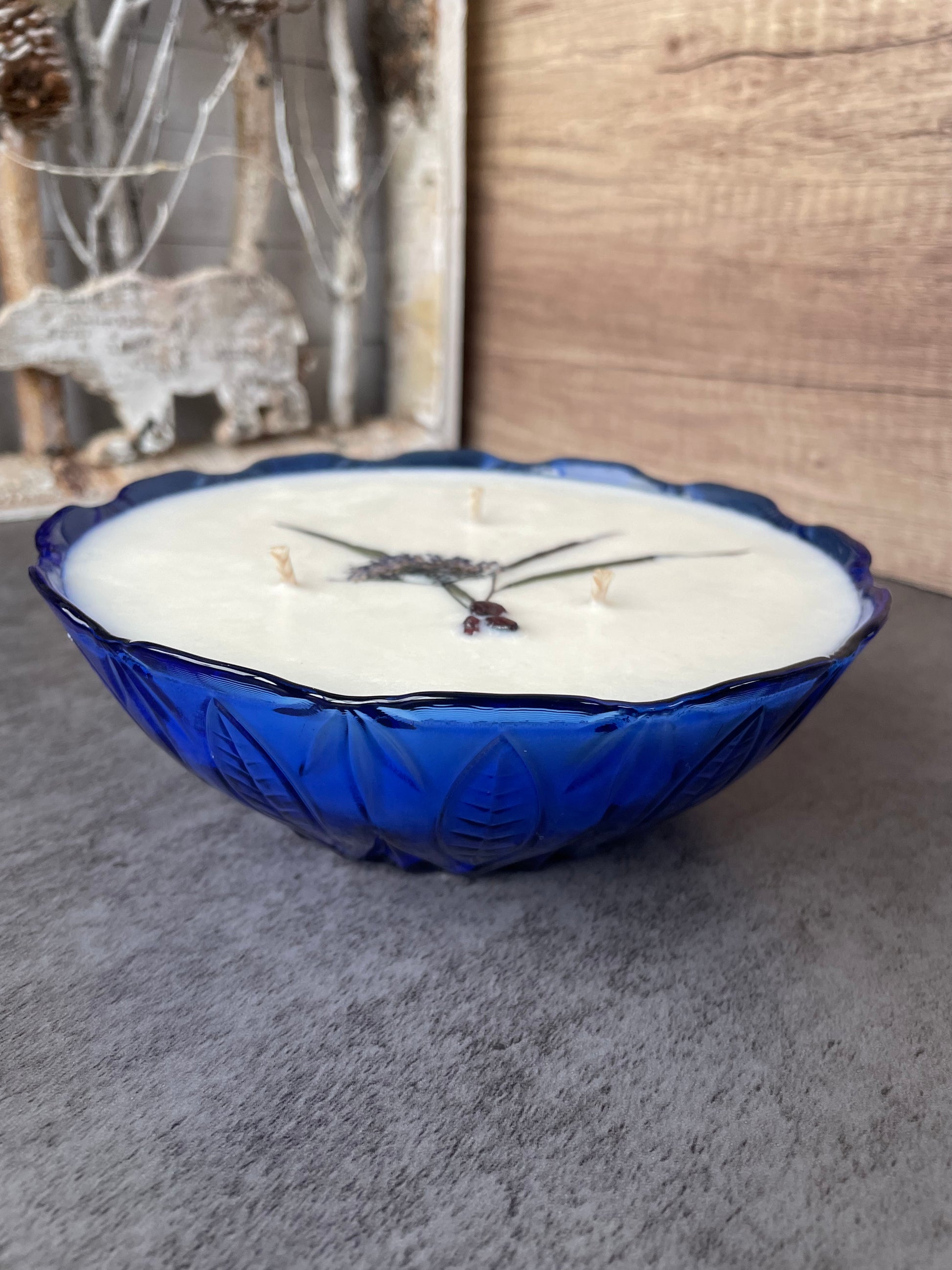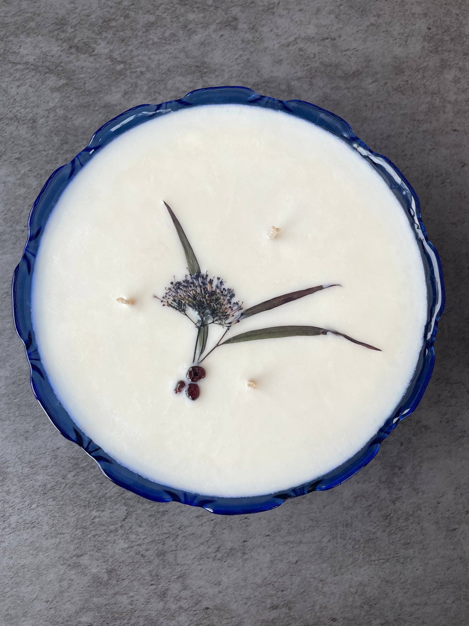 This beautiful vintage Avon blue bowl is filled with our Speakeasy scent and is adorned with dried flowers, dried greenery, and garnet stones.