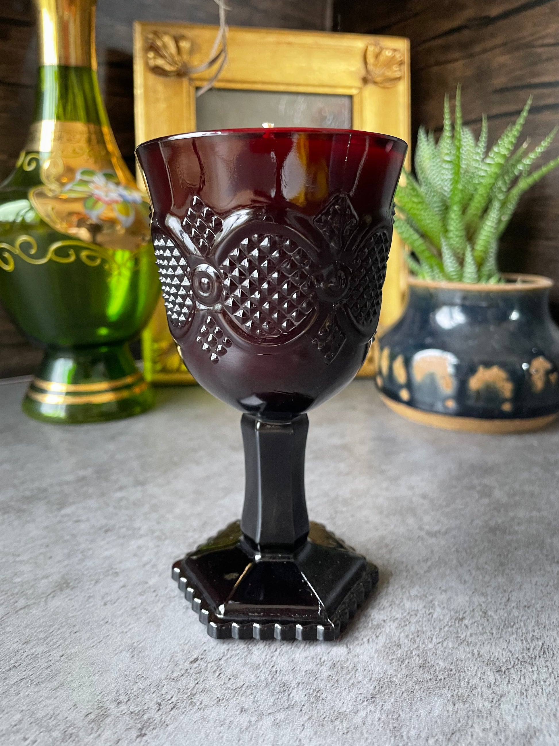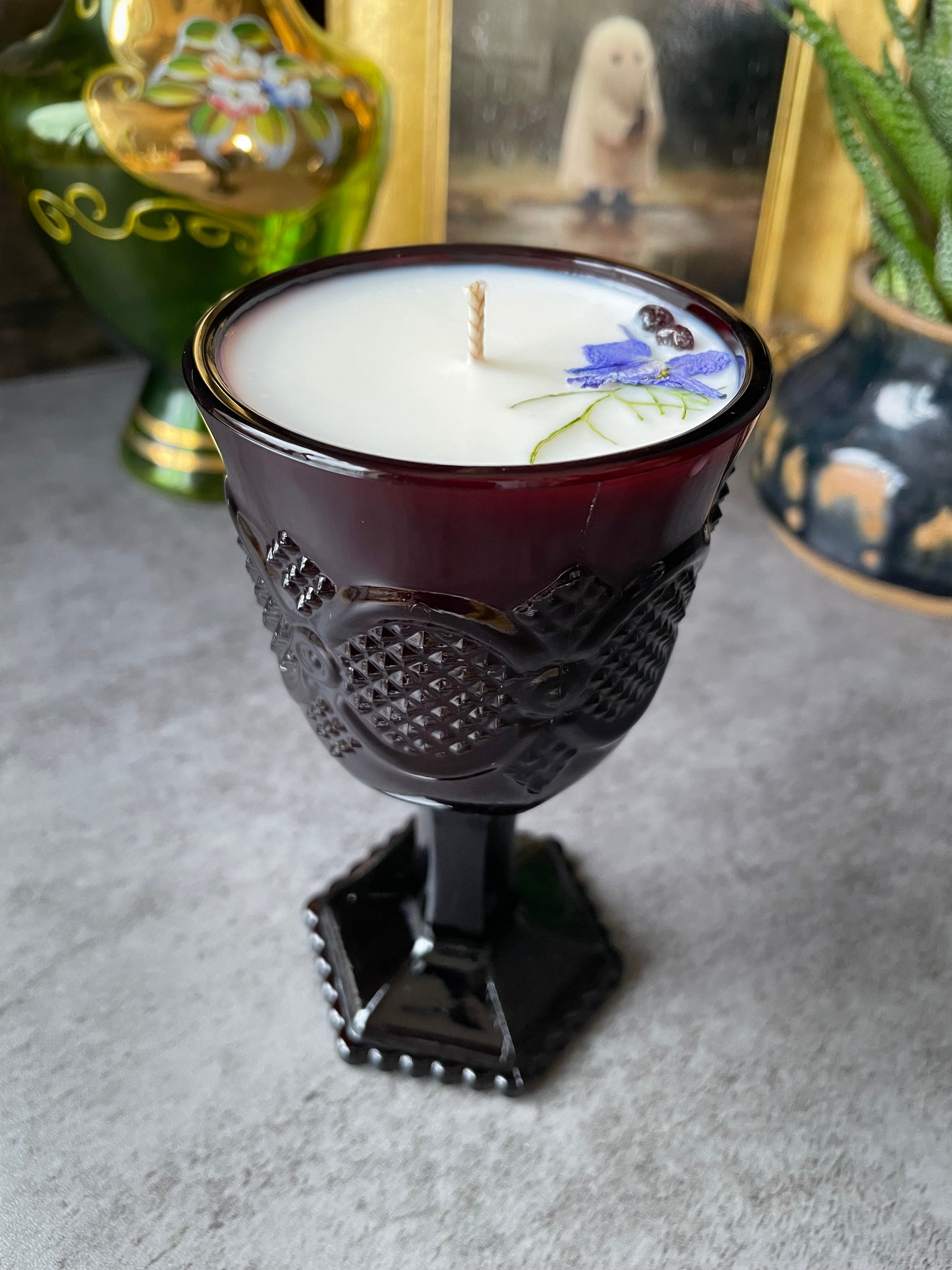This beautiful vintage Avon cape cod glass is filled with our Speakeasy scent and is adorned with dried greenery, dried flowers, and garnet stones.