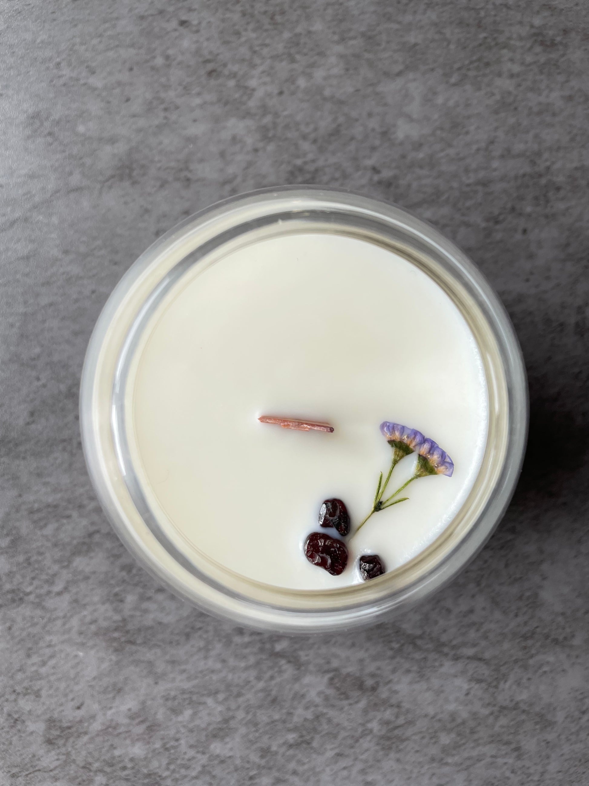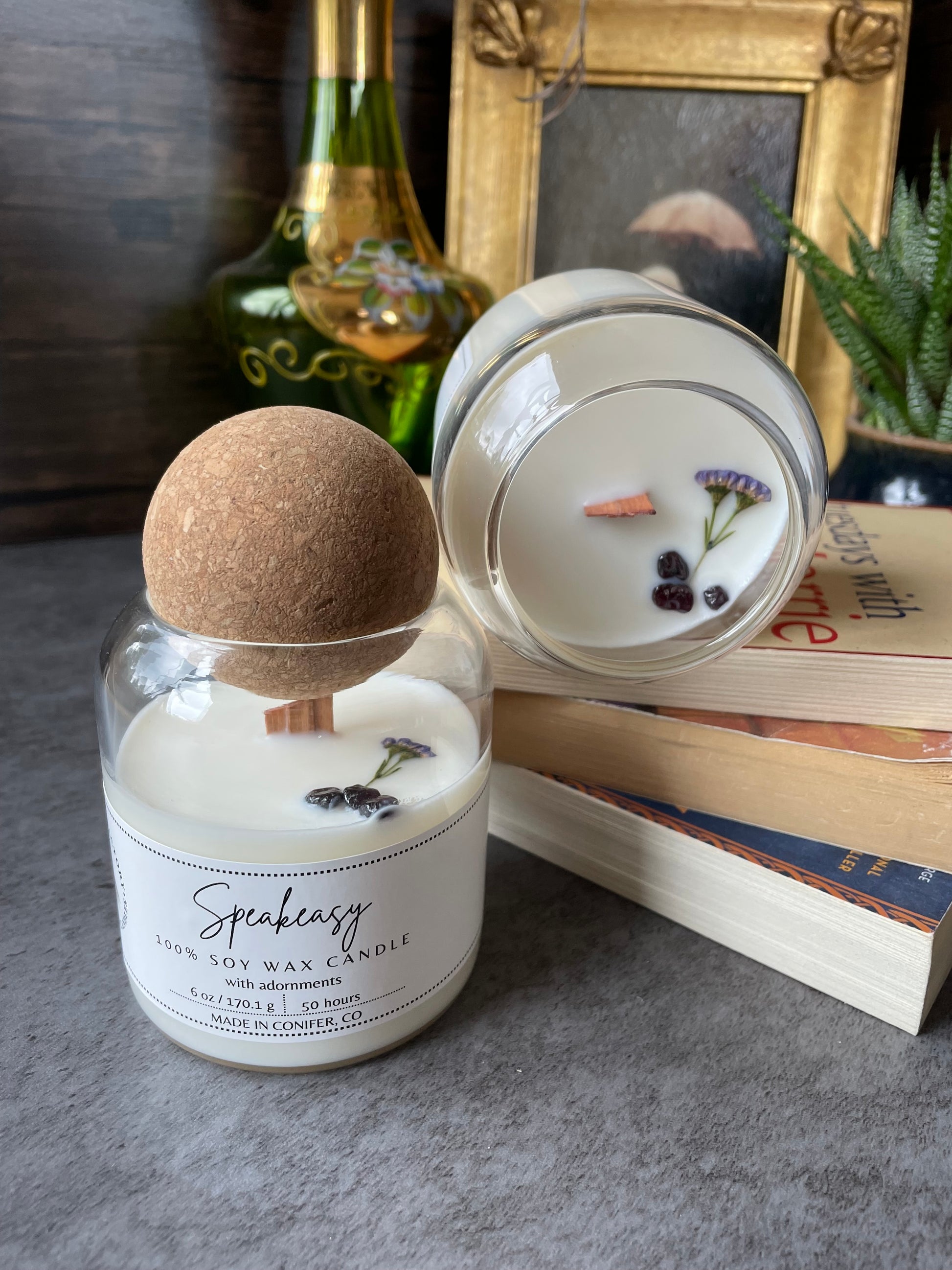 These beautiful wooden wick jars come with a globe shaped cork top and burn for 50 hours. The Speakeasy scent is adorned with dried flowers and garnet stones.