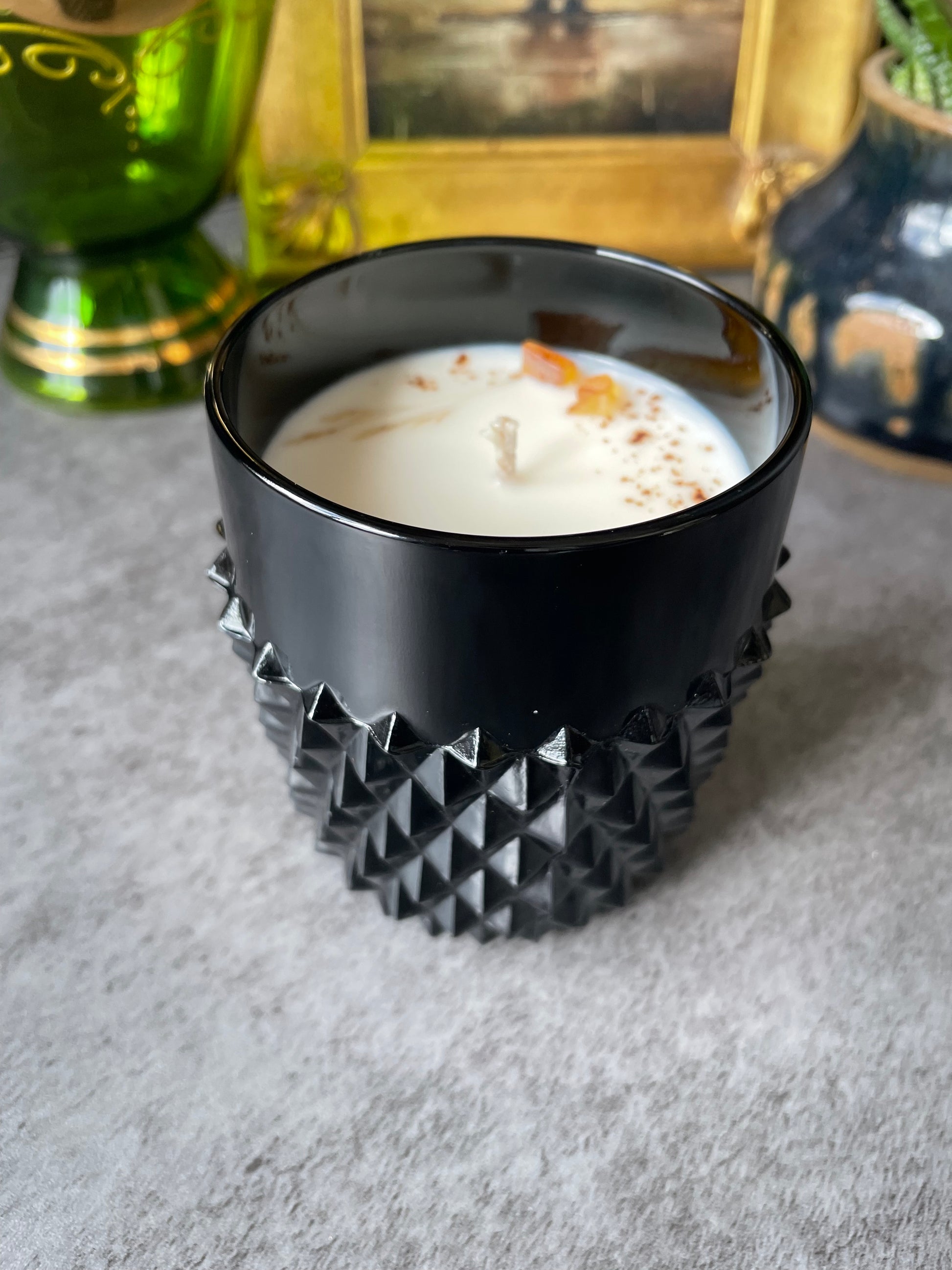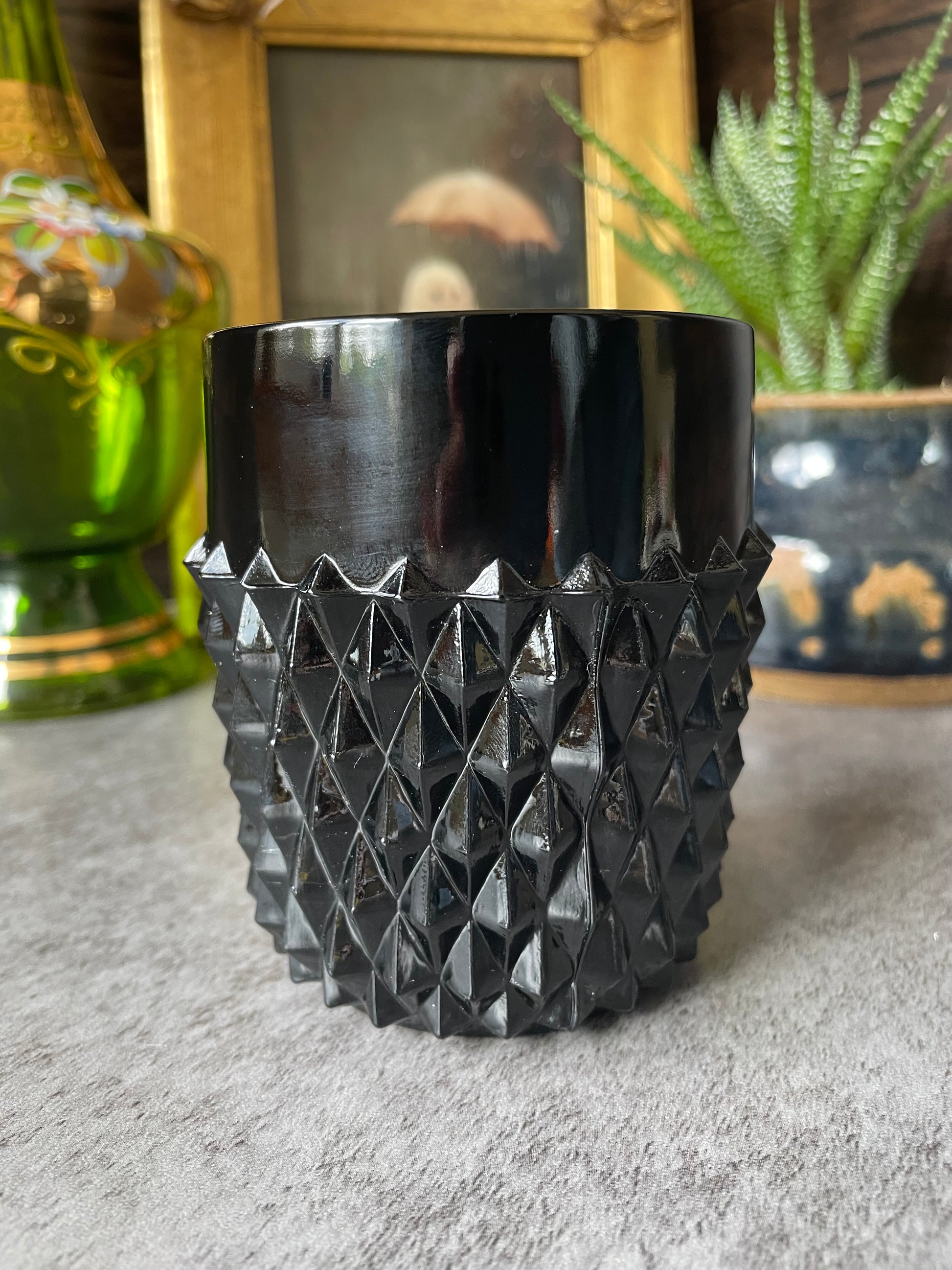 This beautiful vintage black Tiara Diamond point glass is filled with our Spiced Pumpkin Pie scent. It is adorned with dried grasses, amber stones, and cinnamon spice.