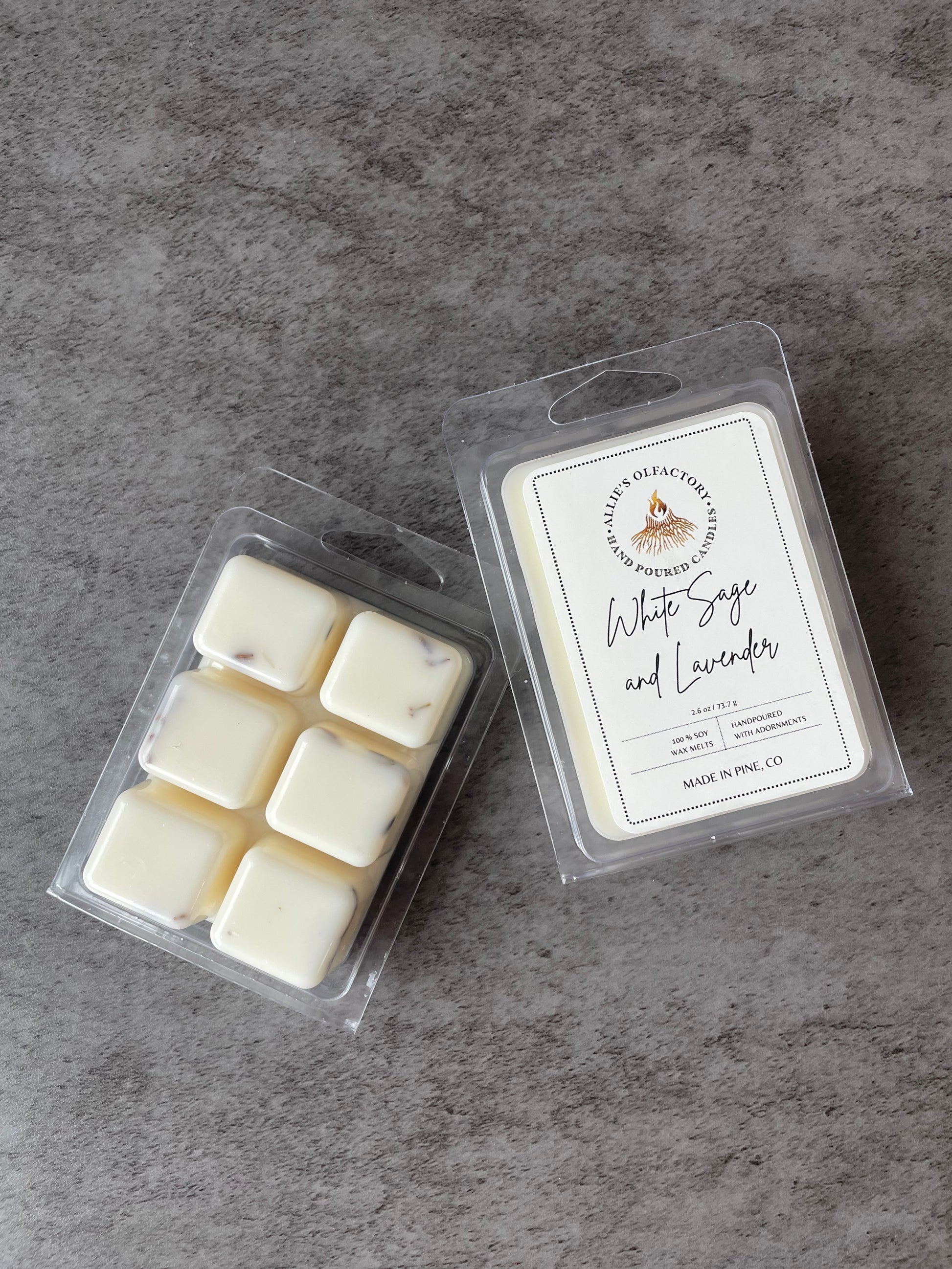 100% Soy Wax melts, White Sage and Lavender scent with lavender buds and crushed sage