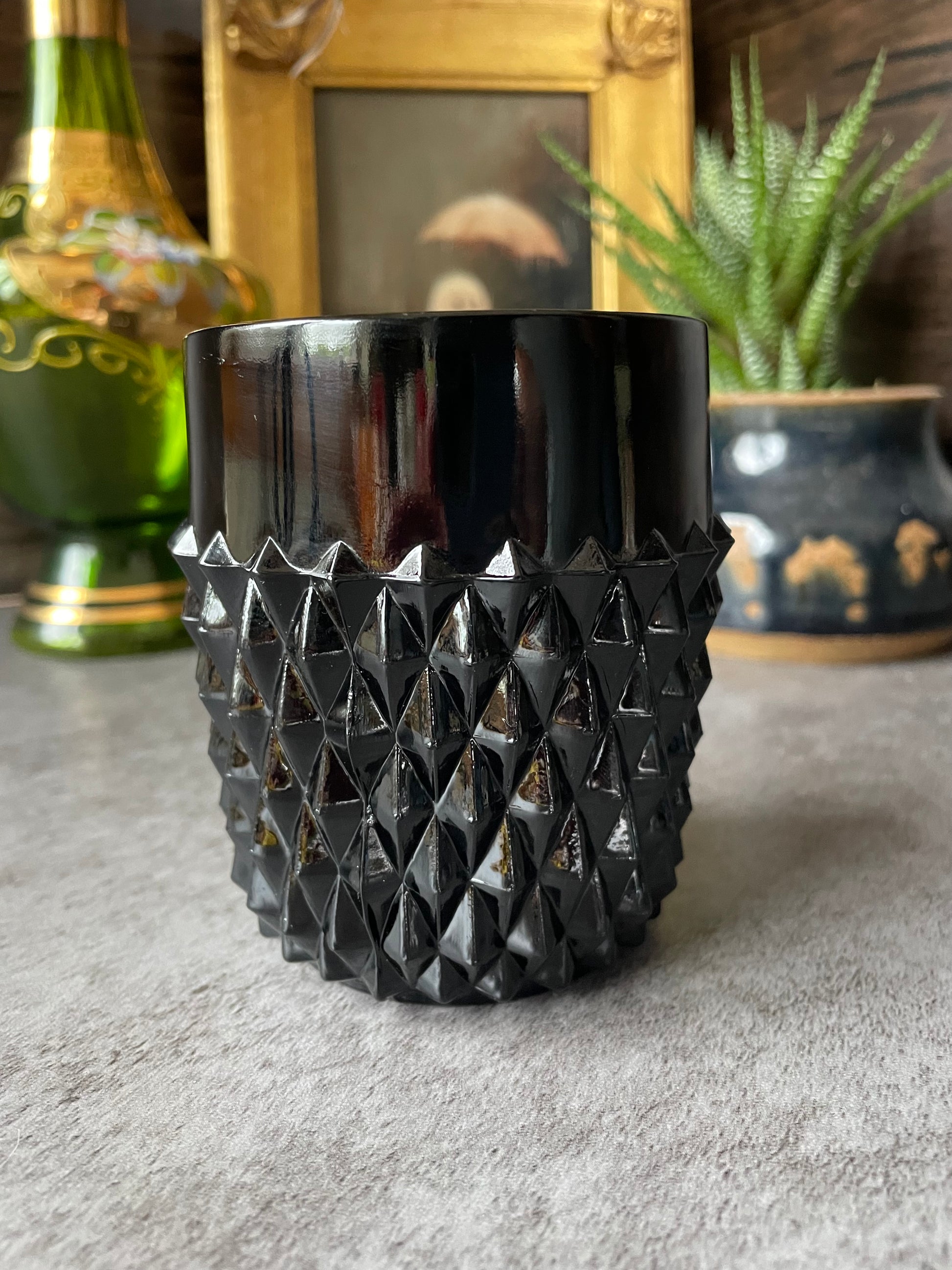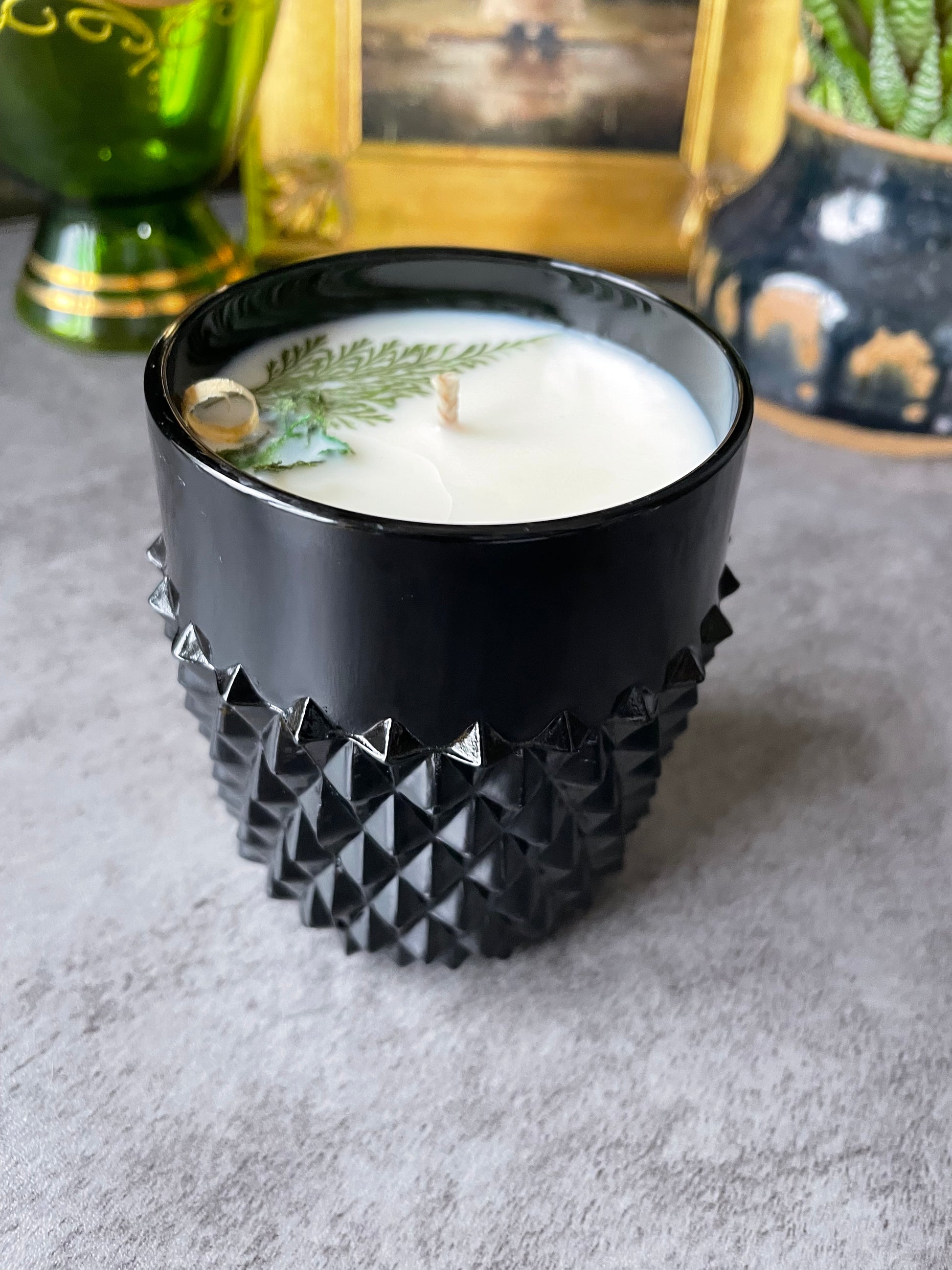 This vintage black Tiara diamond point glass is filled with our Woodland Fog scent and is adorned with dried greenery, dried moss, and palo santo shavings.