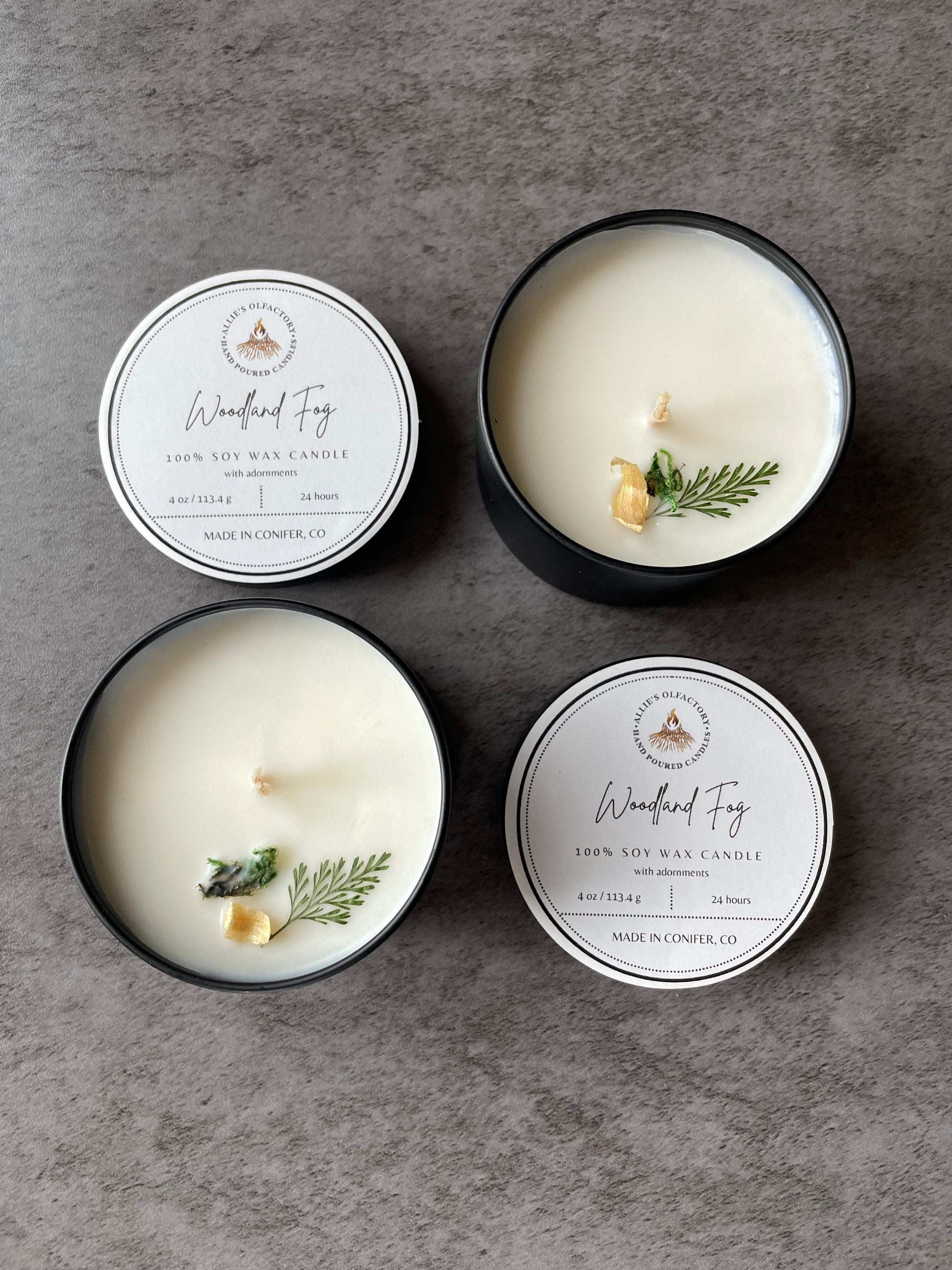 100% Soy Wax tin, Woodland Fog scent adorned a dried greenery, dried moss, and palo santo shavings.